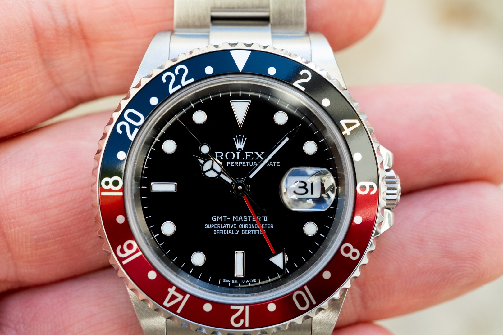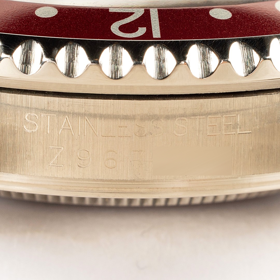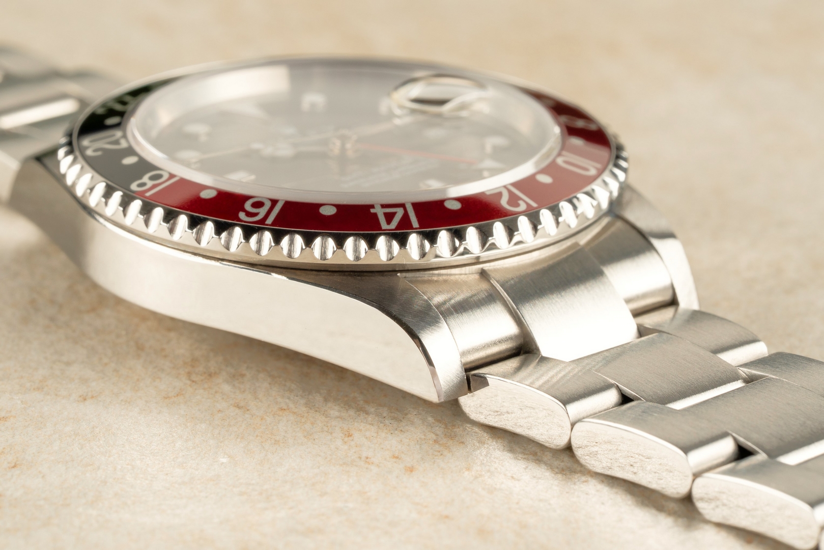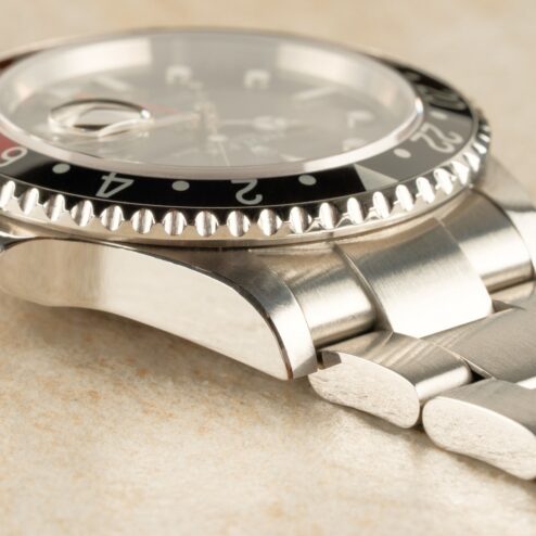 The GMT-Master II dial is in perfect condition. This is the rare and demanded rectangular version. The Roman numeral II was printed slightly short, so the crossbars end above the horizontal lines, creating a rectangle, hence the name “rectangular.”