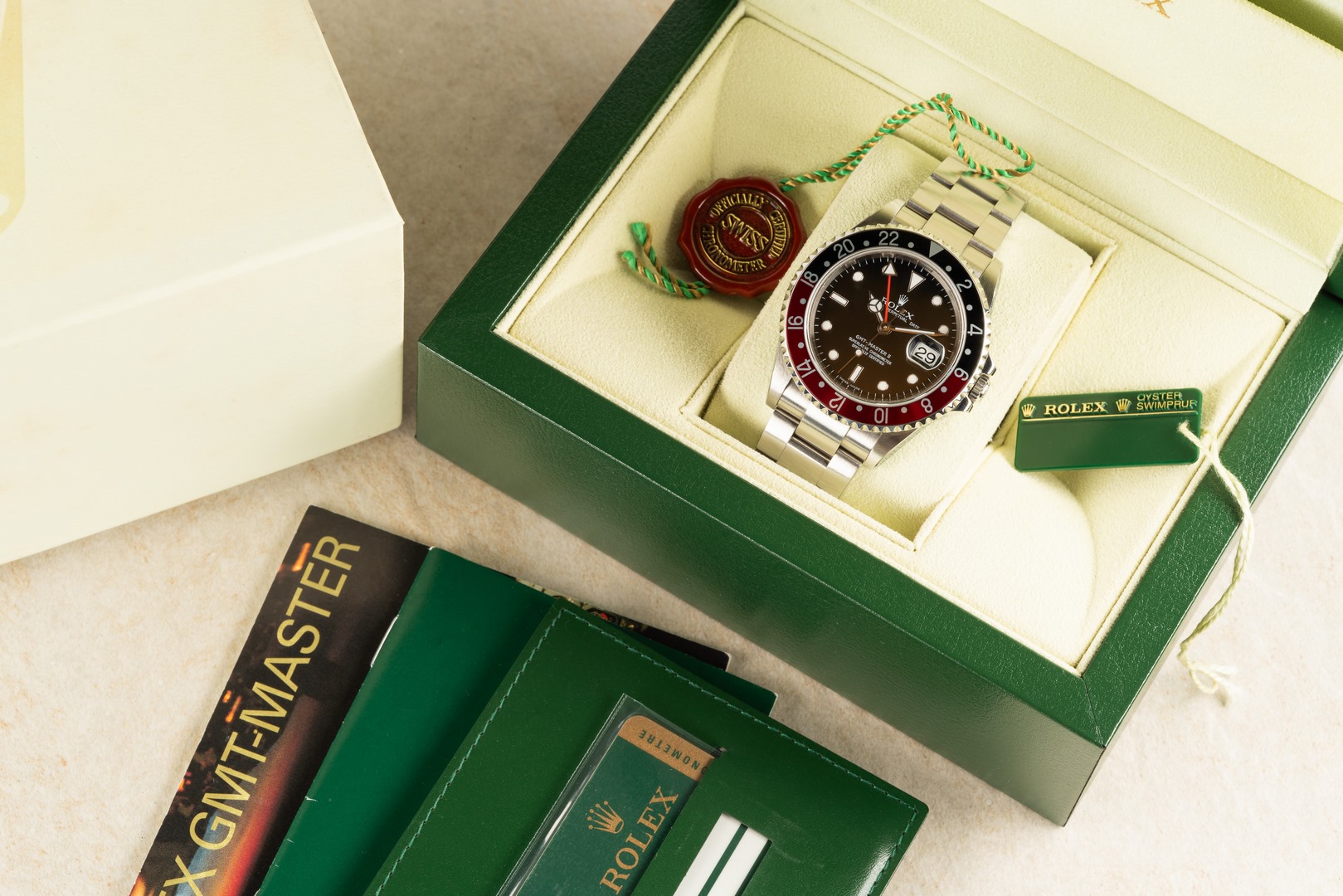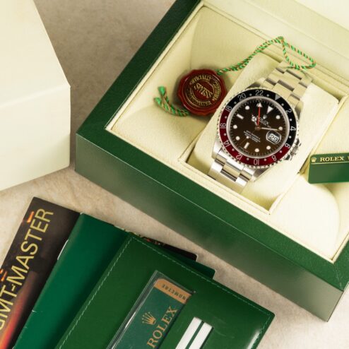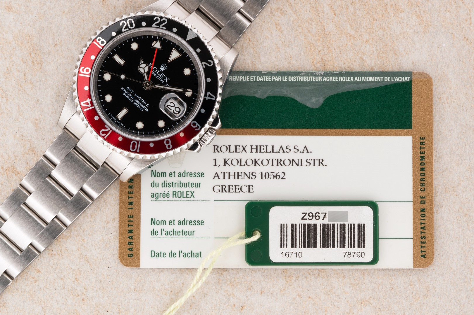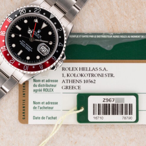 We are offering this watch as a fantastic full set. It has been originally sold in Greece, and the full set is truly excellent, including the GMT-Master booklet and hang tag with serial number.