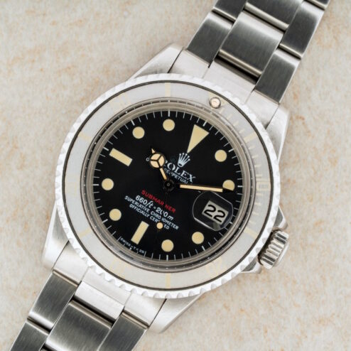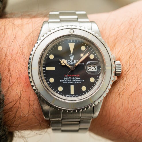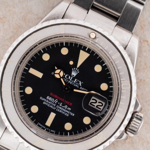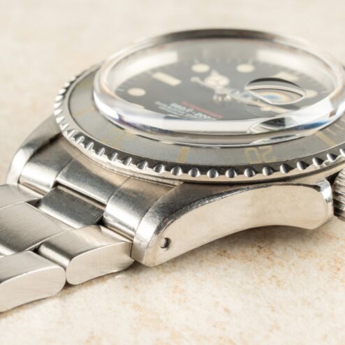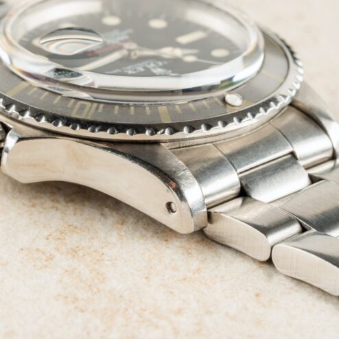 The case is in excellent condition. As the pictures show, the case is wonderfully fat and has exactly the proportions one would expect from a Red Submariner from the early 1970s. I would say the watch is unpolished or perhaps minimally polished. In any case, it’s a top-notch case that leaves nothing to be desired. There are some signs of wear and a bit of sleeve polish but that’s exactly what a great vintage case looks like.