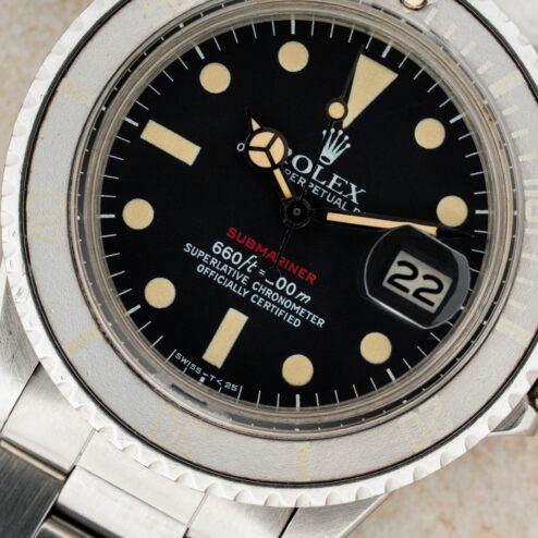 One of the highlights of this watch is certainly the magnificent Red Submariner dial. It’s the MK6 variant, recognizable by the vibrant red lettering and the closed 6s and 660ft. The condition is truly great. The lume has a wonderful patina, there’s absolutely no damage to the dial, and the vibrant red lettering of the Submariner logo is a defining feature.