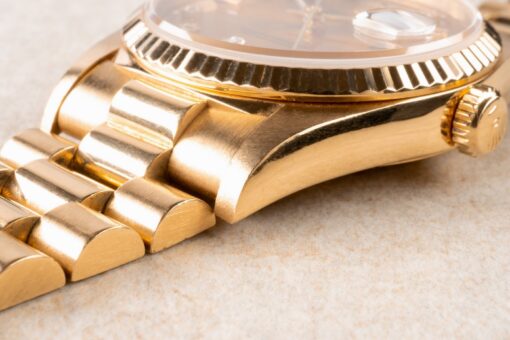 What an incredibly casual and unique day date. Before you read the text, look at the pictures. This watch and especially the dial have undergone a wonderful metamorphosis. Originally born classically golden, the dial has developed a unique and beautiful patina over the decades. Depending on the angle and the incidence of light, the dial shines from super strong gold to clear orange. Unique and beautiful.