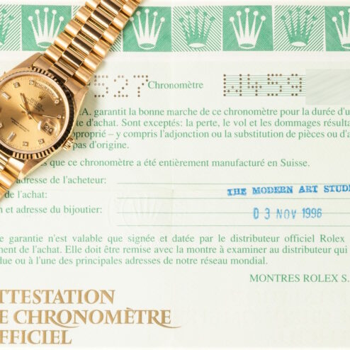 Perfect Double Quick Day Date with box and papers from Bahrain. The case is wonderful. Perfect proportions, wonderfully sharp edges and an equally perfect matt finish on the top of the case leave nothing to be desired. Signs of wear could only be spotted with a loupe! With an 18238 or generally all day-dates with a five-digit reference number, in addition to the four lugs of the case, I always use the bezel to evaluate the quality of the watch and everything simply fits here, because the bezel is also razor-sharp with minimal signs of wear. The gold sunray cut dial set with diamonds is in perfect condition. All tritium index points are very well preserved and show a slightly creamy patina. The tritium hands are in the same perfect condition. The watch comes as a full set with box and papers. It has been sold by rolex authorized dealer The Modern ART Studio in Bahrain on 11/03/1996. The 8385 President bracelet is in the same wonderful condition as the case. It is also characterized by minimal signs of wear and almost no stretch. The clasp code is V4 for April 1996, so it is the original bracelet to the watch. Furthermore, it is complete and comes with 24 links!