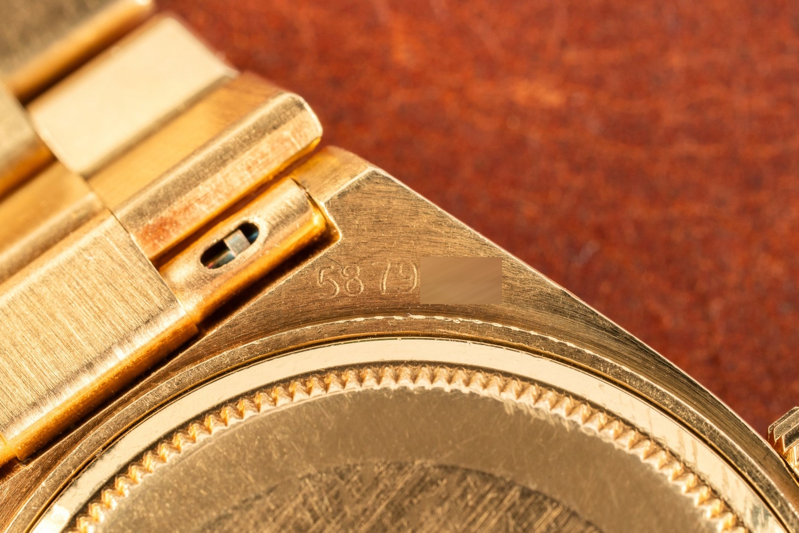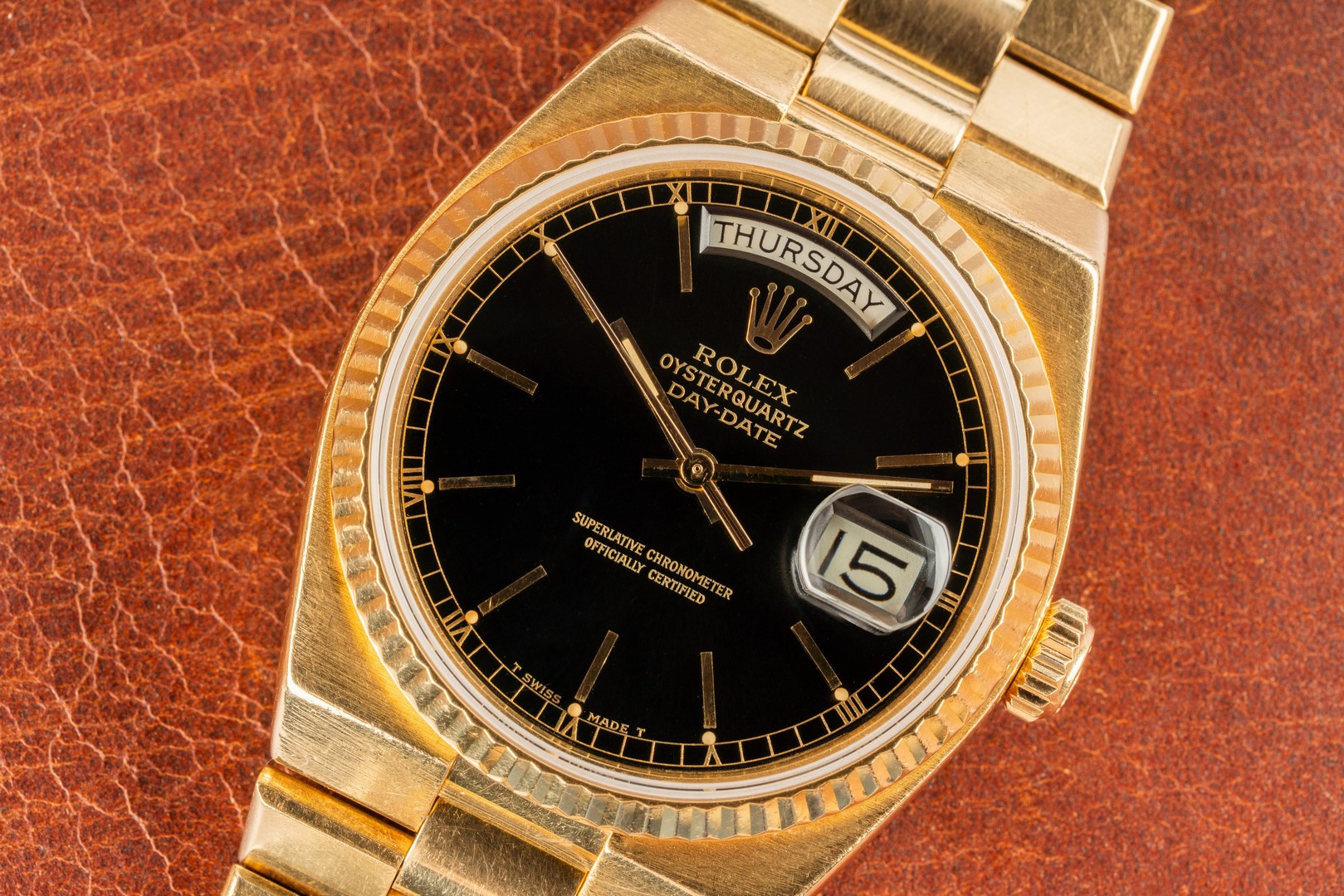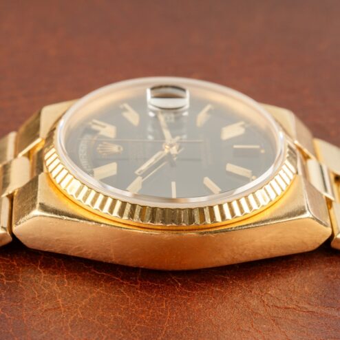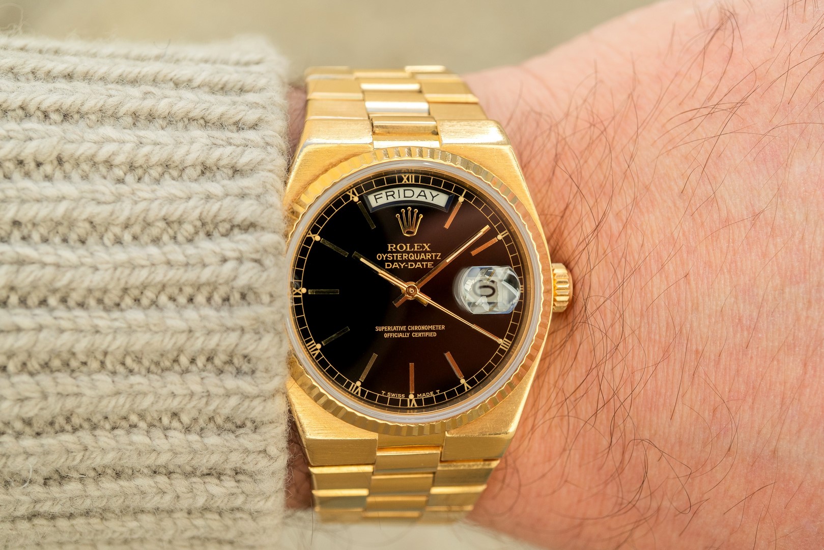 The case is in excellent condition. Yes, it shows signs of wear and some sleeve polish, but it also demonstrates wonderful substance. An Oysterquartz Day-Date can always be judged by the distance between the bezel and the case edge. You should always be able to see the case between the bezel and the case edge; if so, the watch is in top condition, and this one is. Frankly, the case is almost certainly unpolished. Everything is just right, including the vertical matting on the case