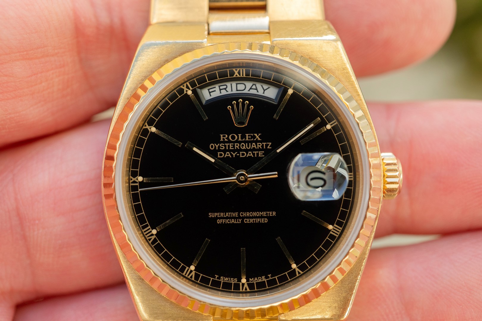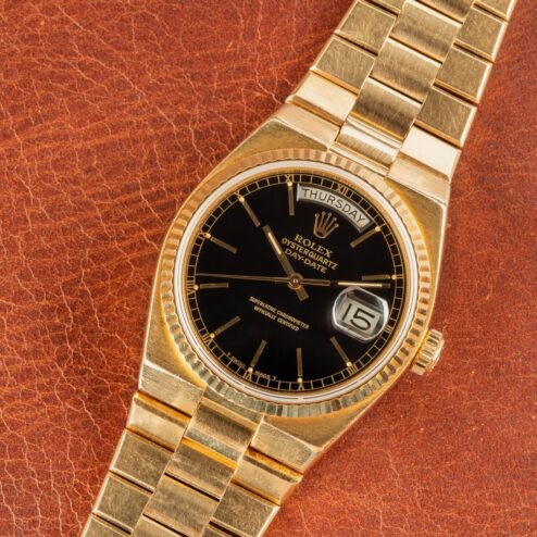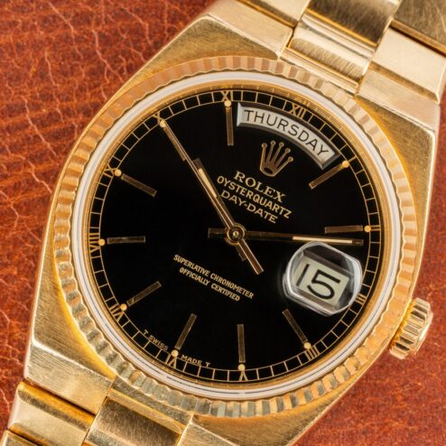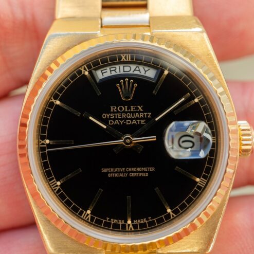 A wonderful Swiss Oysterquartz Day-Date with a demanded black dial.