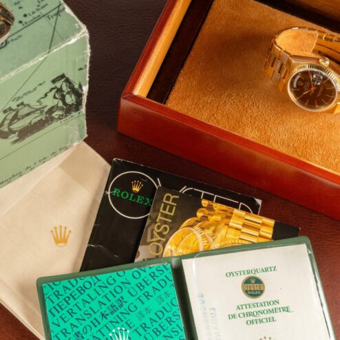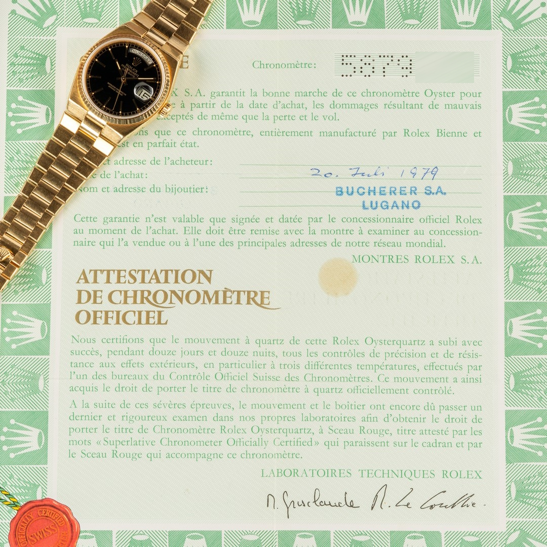 This cool Day-Date delights its owner as a wonderful set from beautiful Switzerland. It has been sold on July 20, 1979, by rolex authorized dealer Bucherer in Lugano. The set is truly beautiful, including the original catalog, polishing cloth, and Oyster booklet.