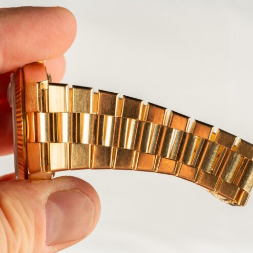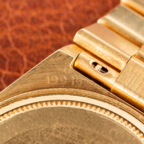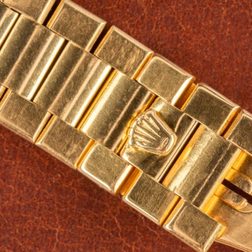 The integrated 18-karat yellow gold Oysterquartz bracelet, matching the case, is also in excellent condition. The crown on the clasp is fully intact, with light stretch (see stretch image) and identical signs of wear to the watch. Furthermore, it comes with 24 links and will also fit larger wrists.