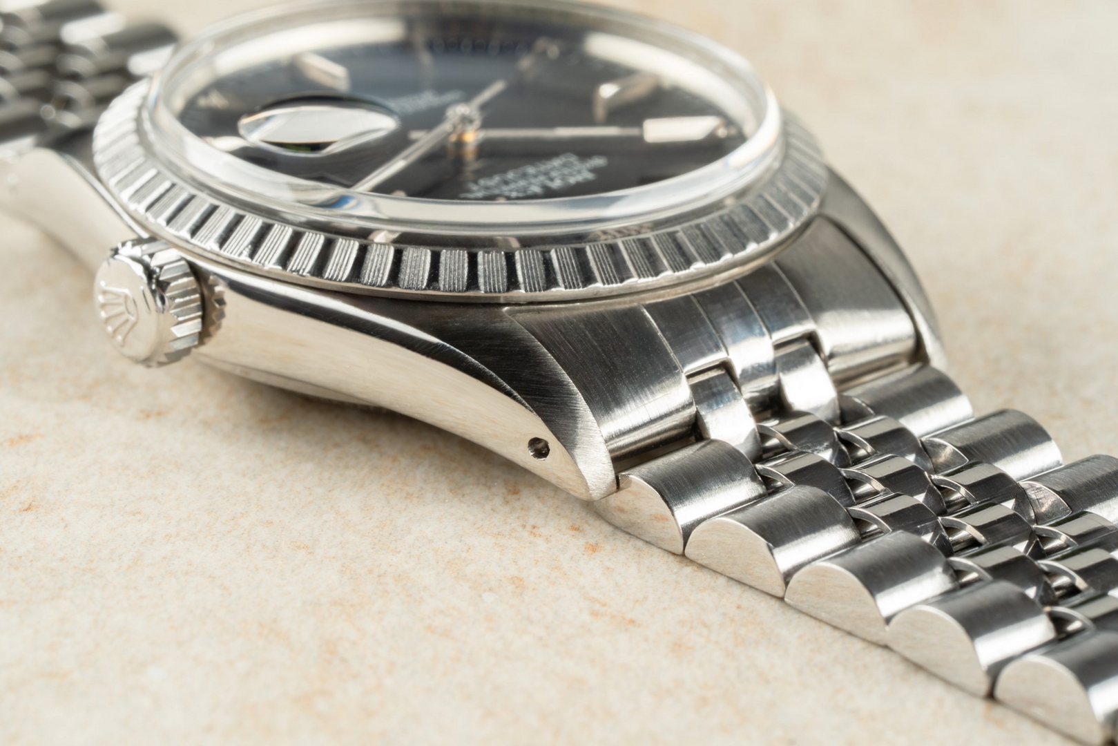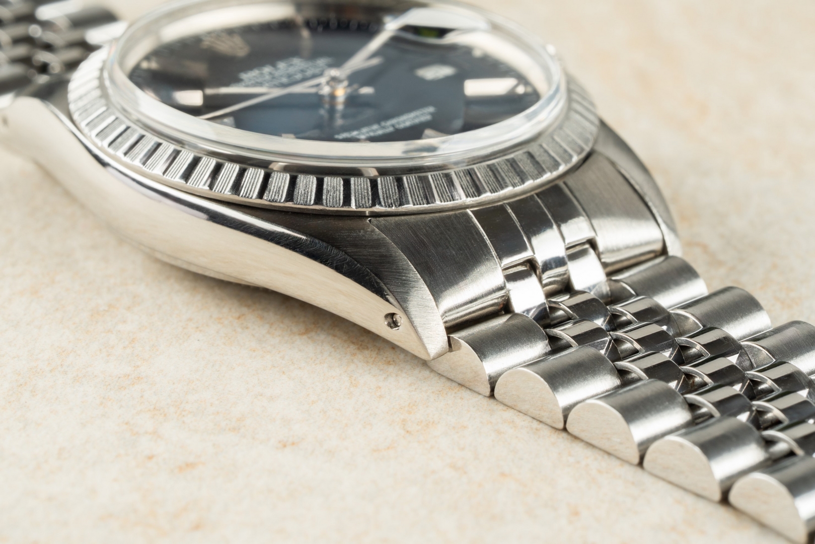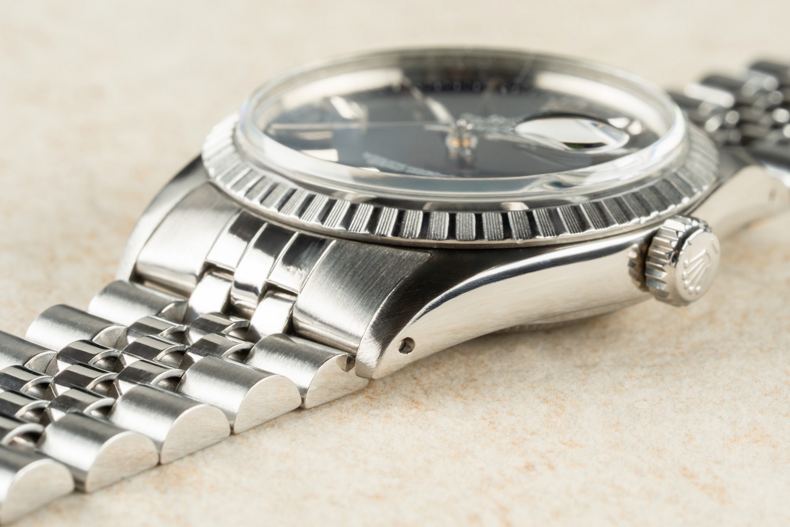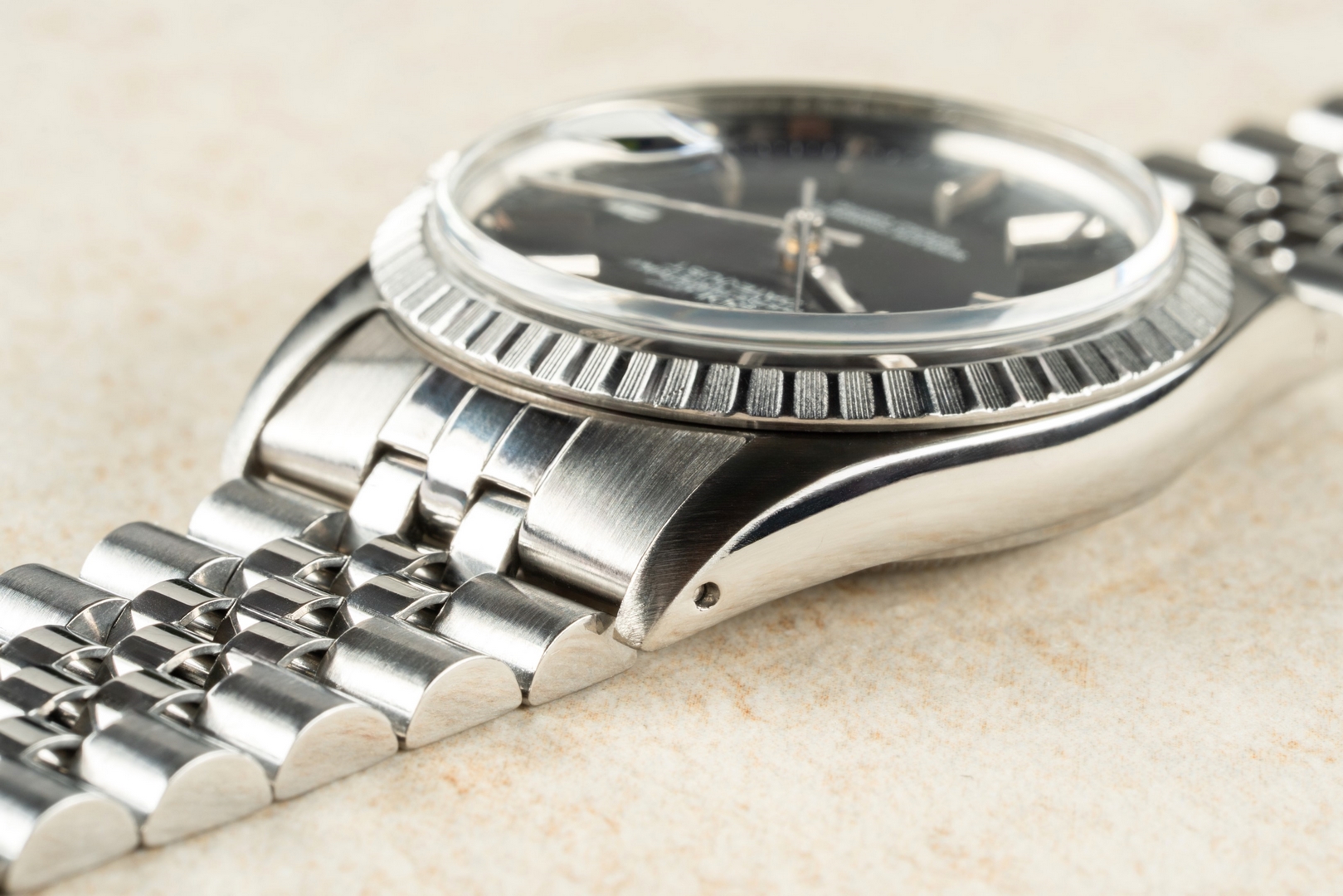 The case is in excellent condition. It has been minimally polished in the past, but this was done gently, as it shows full lugs, perfect proportions, and sharp edges. The matte finish on the top of the case is equally flawless.
