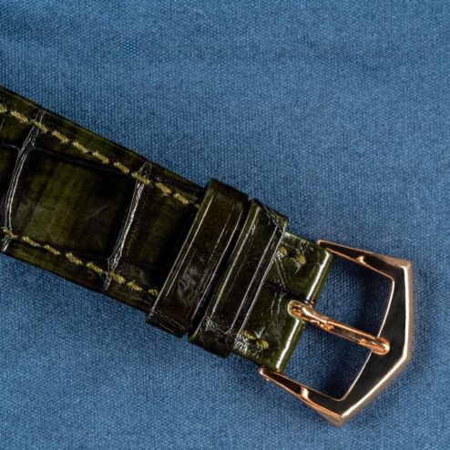 As the watch was always worn with a beige leather strap, the original green Patek Philippe leather strap is unused and in perfect condition. The 18-karat rose gold pin buckle, just as the watch itself, is in excellent condition with only light signs of wear.