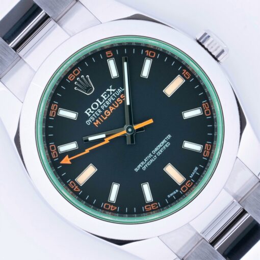 Das grüne Milgauss Glas ist perfekt und ohne Beschädigungen.
