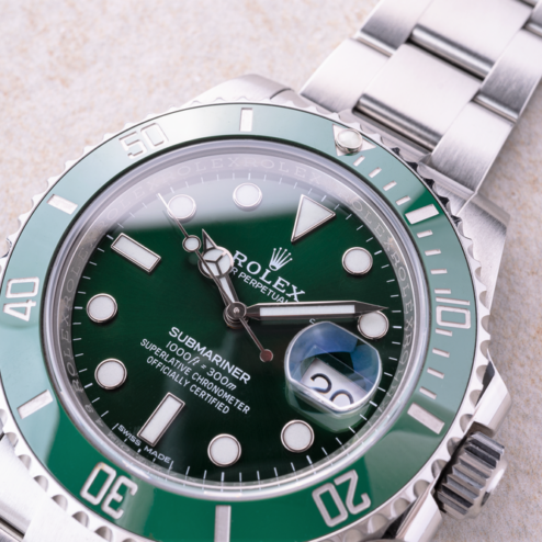 Das grüne Sonnenschliff Submariner Blatt ist im perfekten Zustand wie erwartet. Die Zeiger sind ebenso perfekt.