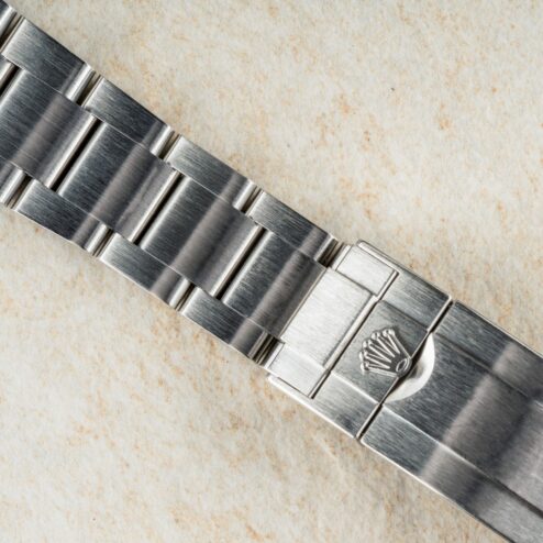 Das Oysterband ist wie die Uhr unpoliert und natürlich original zur Uhr. Es zeigt keinen Stretch und oberflächliche Tragespuren.