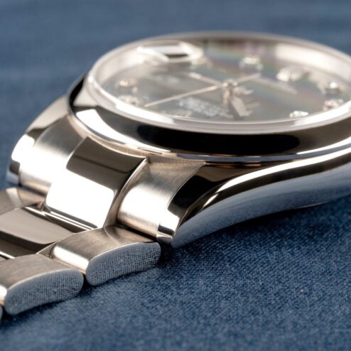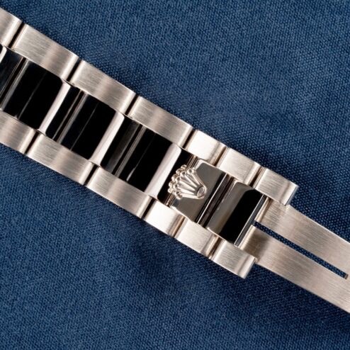 Das weißgoldene Oysterband ist wie die Uhr top. Es zeigt minimalste Tragespuren, kommt mit 11 Gliedern und mit Schließencode DT7 für Juli 2002 handelt es sich um das Originalband zur Uhr.