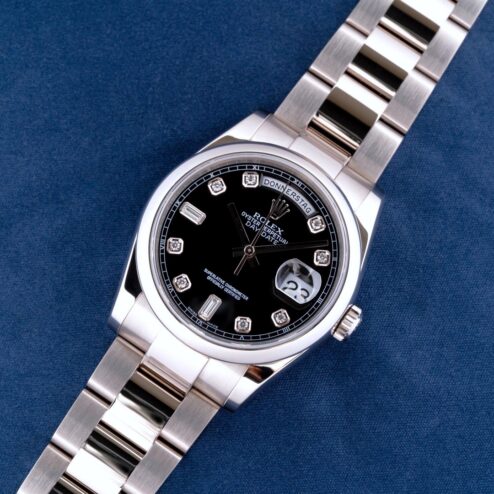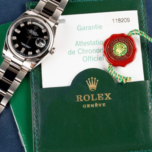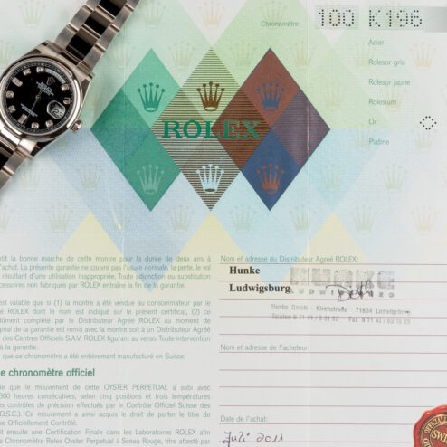 Diese tolle Weißgold Day-Date kommt mit Box und Papieren aus Deutschland. Sie wurde im Juli 2011 von Juwelier Hunke in Ludwigsburg verkauft. Auch spannend hier, dass in den frühen 2000ern die Uhren deutlich länger brauchten um verkauft zu werden. 2002 bis 2011 sind immerhin 9 Jahre 😉
