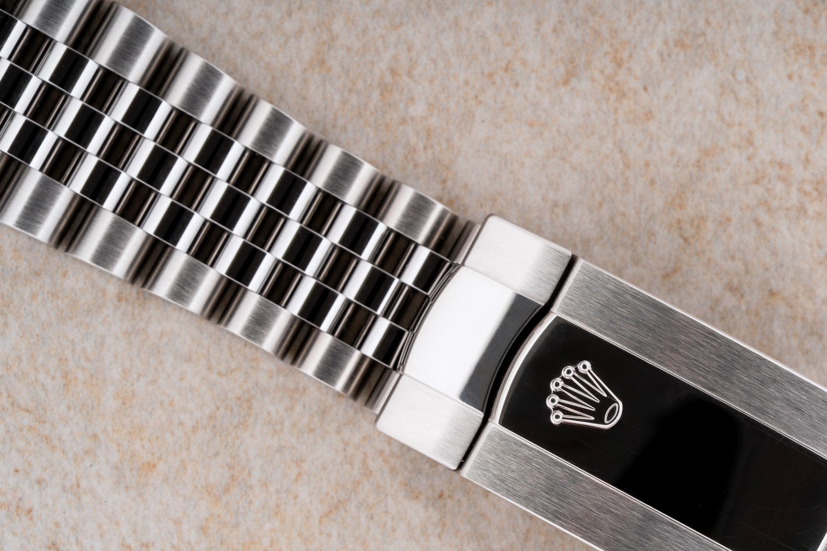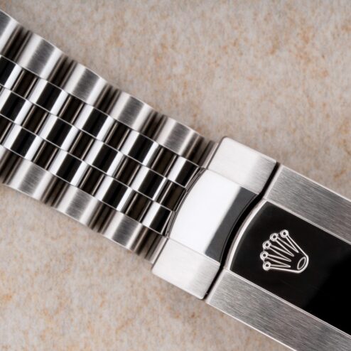 Das originale Jubilee Armband ist die wie die Uhr unpoliert mit geringsten Tragespuren. Auf der Schließe sind die typischen geringen Tragespuren vorhanden. Wir haben diese bewusst belassen und nicht entfernt. Sind ja nach zwei Tagen tragen wieder drauf. Band ist ansonsten perfekt und kommt mit allen Gliedern.