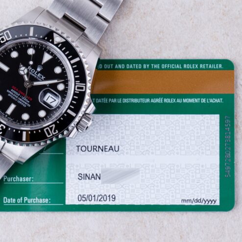 Diese tolle Red Sea-Dweller kommt als Komplettpaket mit Box und Papieren. Sie wurde am 01.05.2019 von Tourneau in den Vereinigten Staaten verkauft. Besonders schön ist auch, dass der originale Hang Tag mit Seriennummer Teil des Lieferumfanges ist.