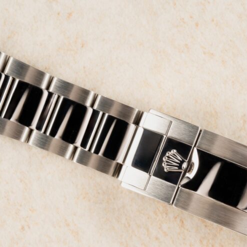 Das Oysterband ist ebenfalls unpoliert und zeigt nur leichte Tragespuren auf den polierten Mittelgliedern, sowie auf der Schließe. Natürlich ist das Band original zur Uhr und kommt mit allen Gliedern.