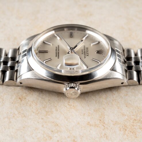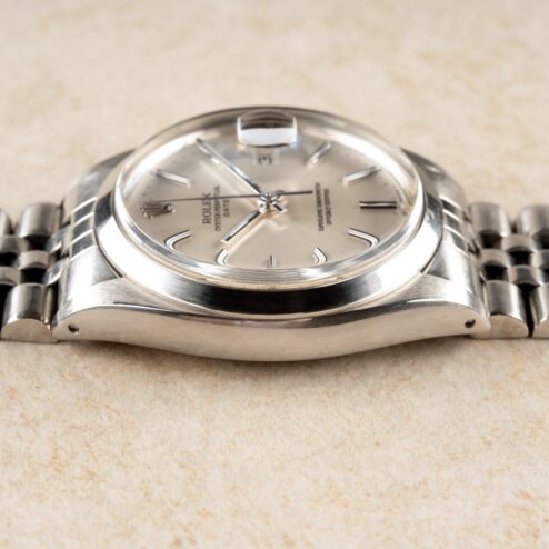 Das Gehäuse ist wurde in der Vergangenheit leicht poliert, aber zeigt die Attribute die es braucht. Saubere Proportionen, schöne Kanten und ein sehr gutes mattes Finish auf der Gehäuseoberseite. Bei einer Date achtet man am besten immer darauf, ob die Lünette massiv übers Gehäuse hinaussteht. Ist das der Fall, dann wurde sie stark poliert. Das wollen wir nicht und daher ist das auch hier nicht der Fall. Klarer Verlauf zwischen Gehäuse und Lünette wie es sein soll.