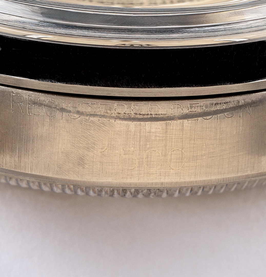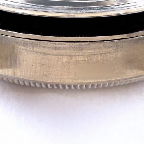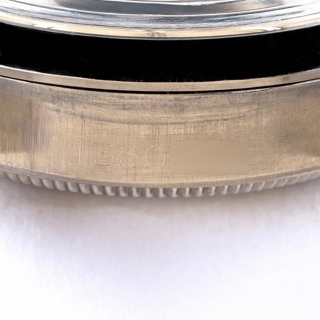 Die glatte Lünette wurde minimalst poliert, zeigt die gleichen leichten Tragespuren wie das Gehäuse und das Plexiglas ist orginal, mit nur minimalsten Spuren.