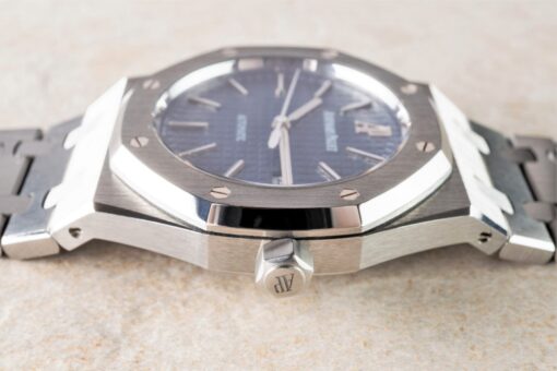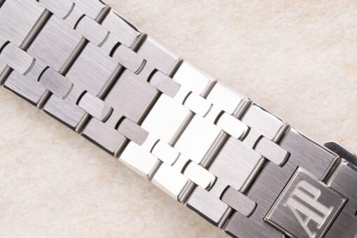 Das integrierte Royal Oak Armband ist ident zur Uhr im wunderbaren Zustand. Minimalster Stretch und minimalste Tragespuren lassen auch hier keine Wünsche offen.