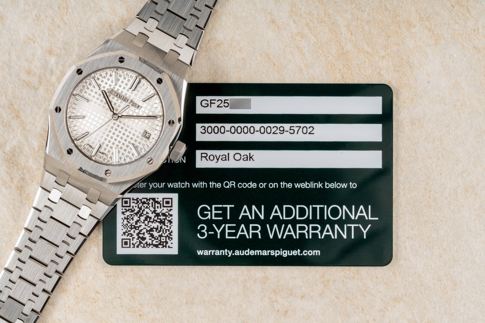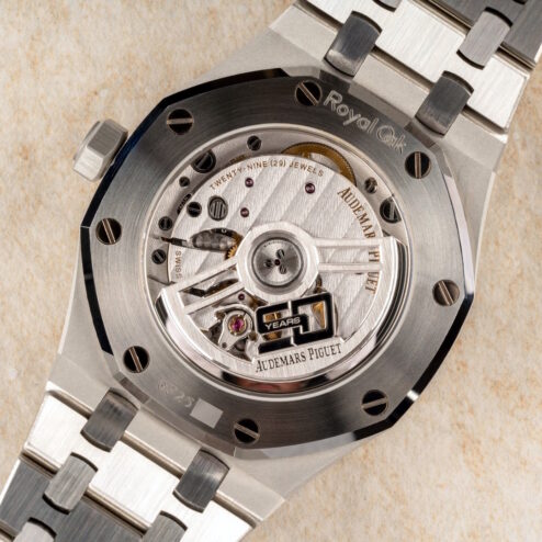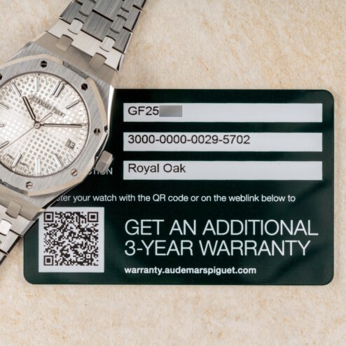 Diese tolle Royal Oak stammt aus der Jubiläums-Edition, was man am speziell gravierten Rotor des Uhrwerkes erkennt. Sie wurde am 04.06.2022 offiziell bei Audemars Piguet registriert. Die Garantie wurde bereits erweitert, sodass volle Audemars Piguet Garantie bis 03.06.2027 besteht.