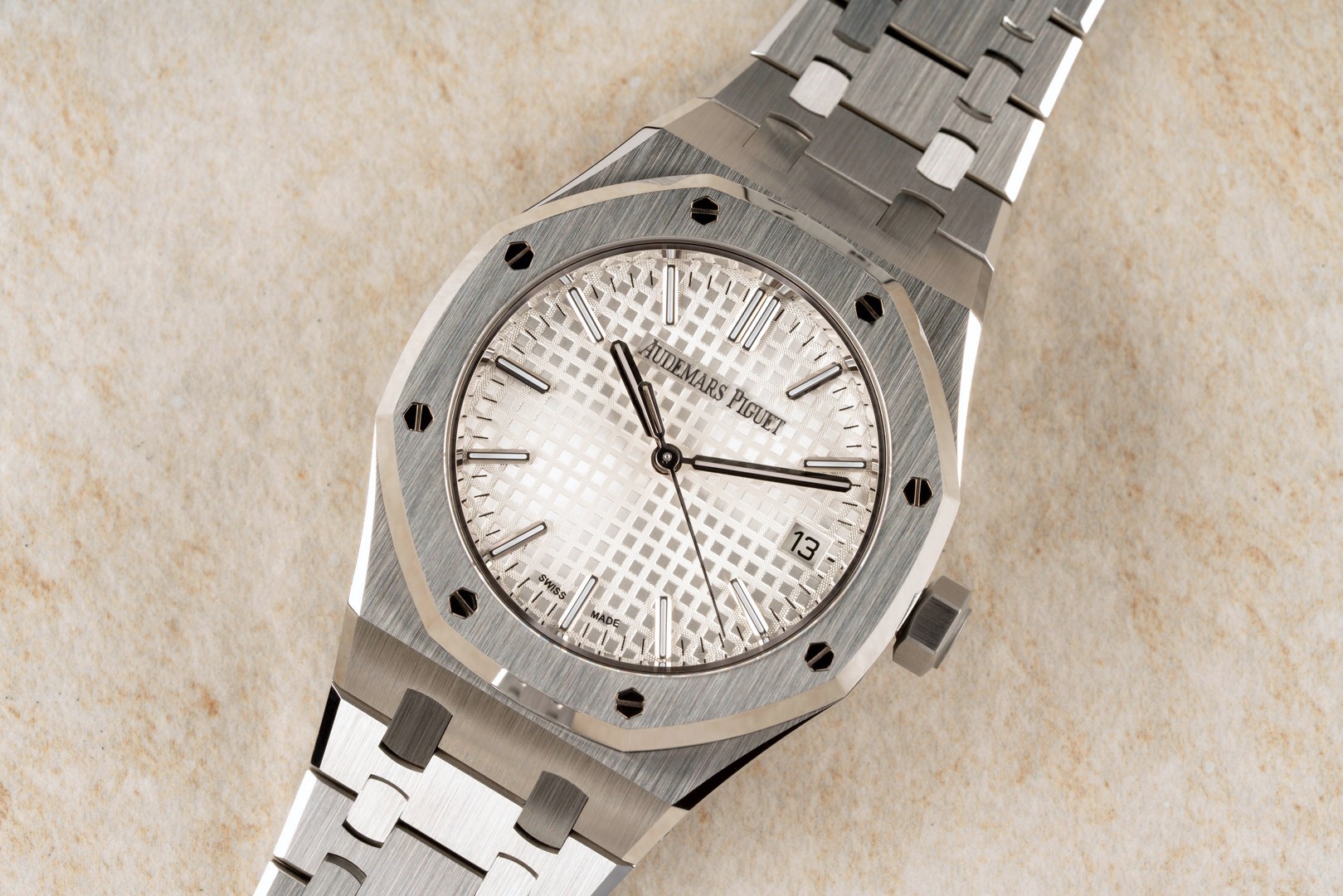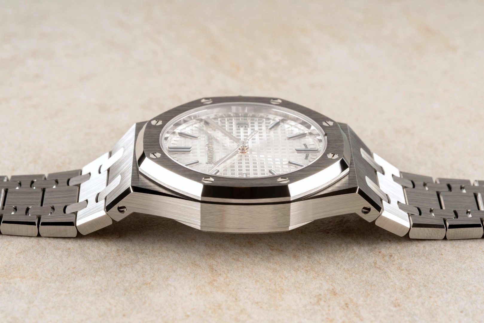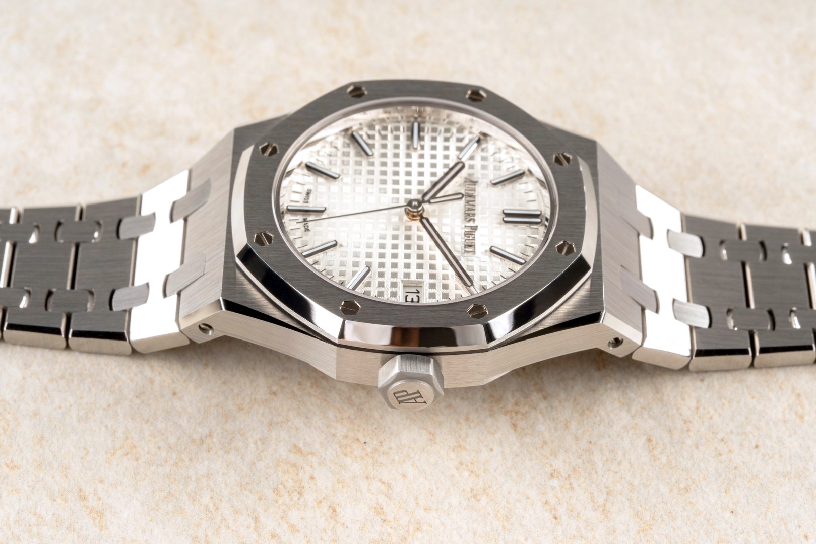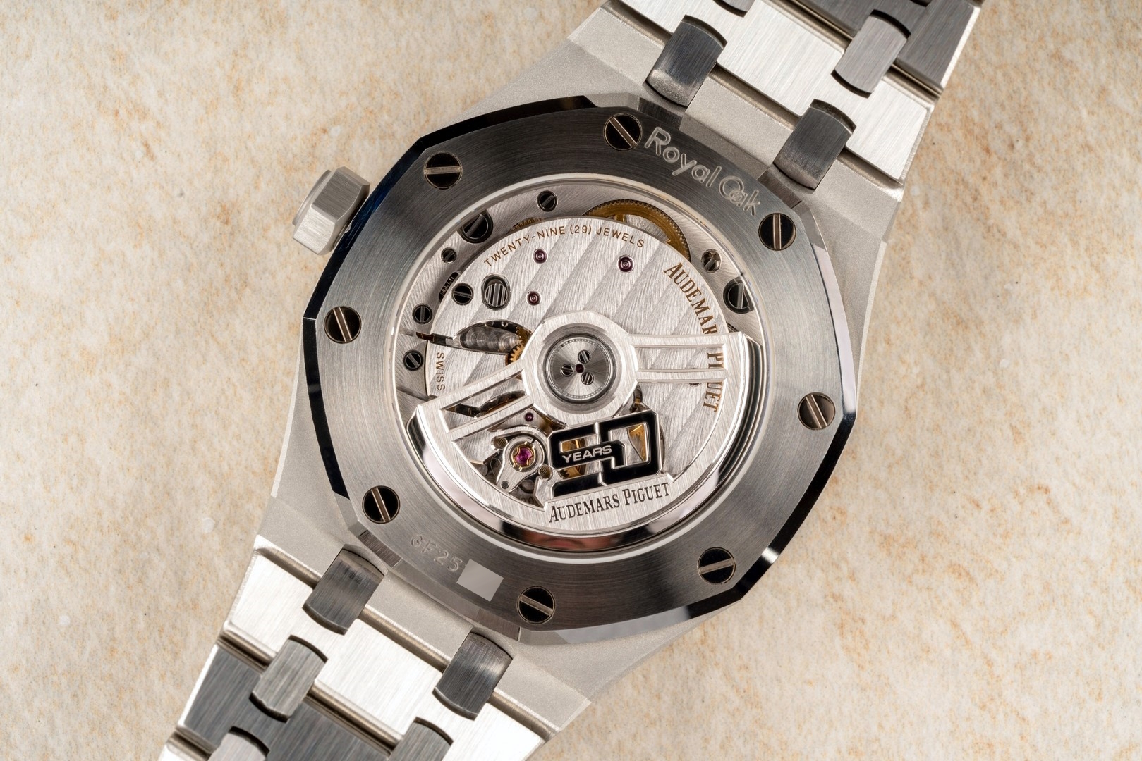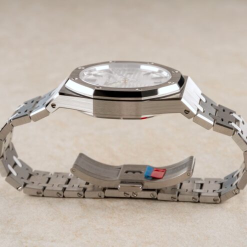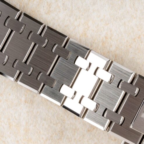 Das originale integrierte Royal Oak Band ist im hervorragenden Zustand. Wir haben hierzu extra ein Bild gefertigt um die Qualität zu zeigen. Es zeigt nur geringste Tragespuren und die geringe Tragezeit der Uhr erkennt man auch an der noch teilverklebten Innenschließe!