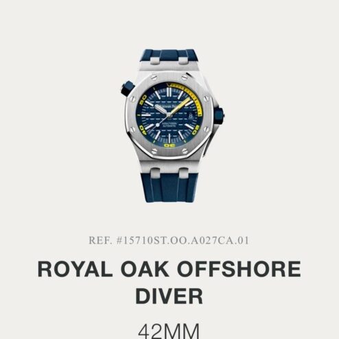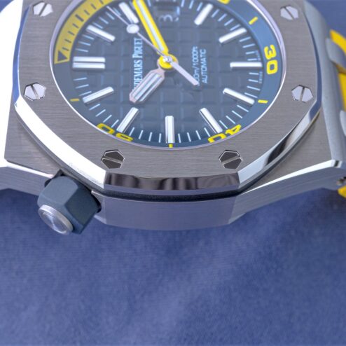 Beschreibung: Blau/Gelbe 2020er Royal Oak Diver im Komplettpaket.