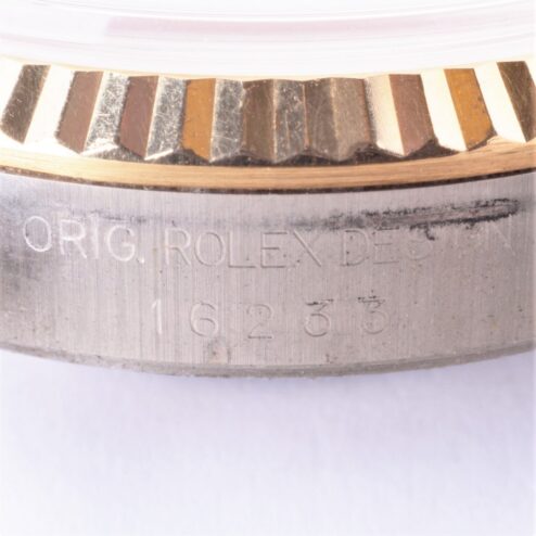 Das 62523H-18 Jubilee Armband (Stahl / 18 Karat Gelbgold) ist im feinen Zustand. Es zeigt geringen Stretch, trägt sich perfekt und kommt mit allen Gliedern. Der Schließencode lautet AB5 für Mai 2000 und somit handelt es sich um das Originalband zur Uhr.