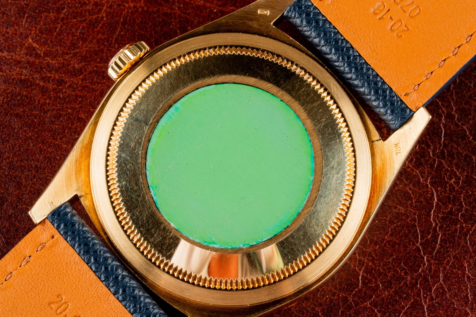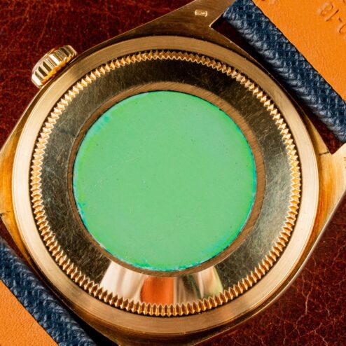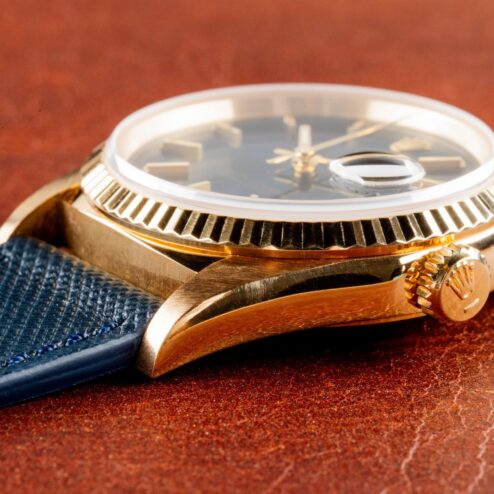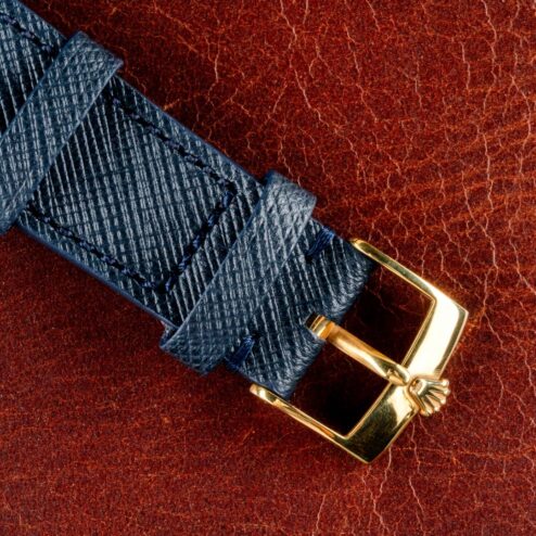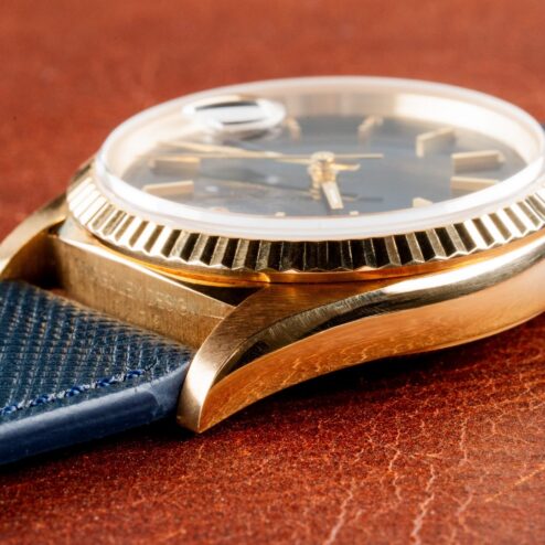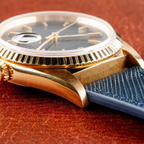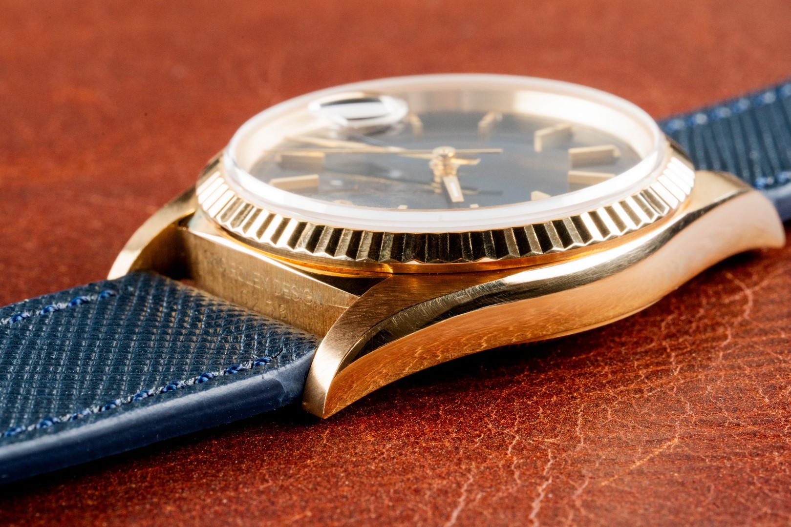 Die kommt am brandneuen blauen Molequin Lederarmband und mit Rolex Dornschließe (vergoldet). Aufgrund des nicht vorhandenen Bandabriebes am Gehäuse sind wir übrigens sehr sicher, dass die Uhr immer am Lederband getragen und auch ausgeliefert wurde.