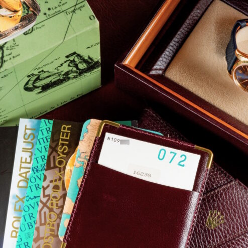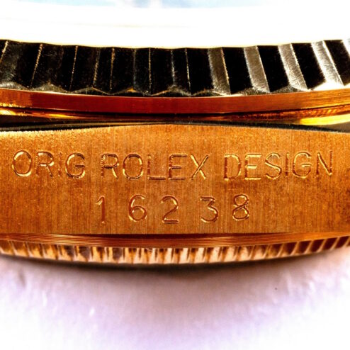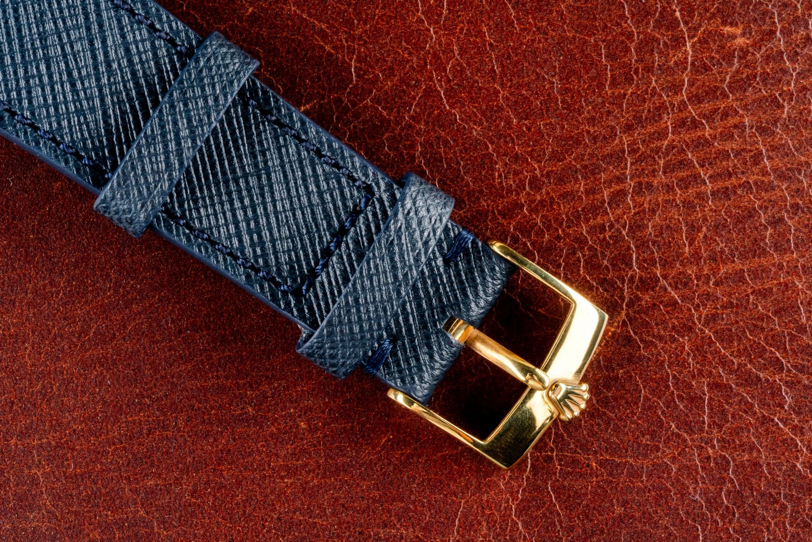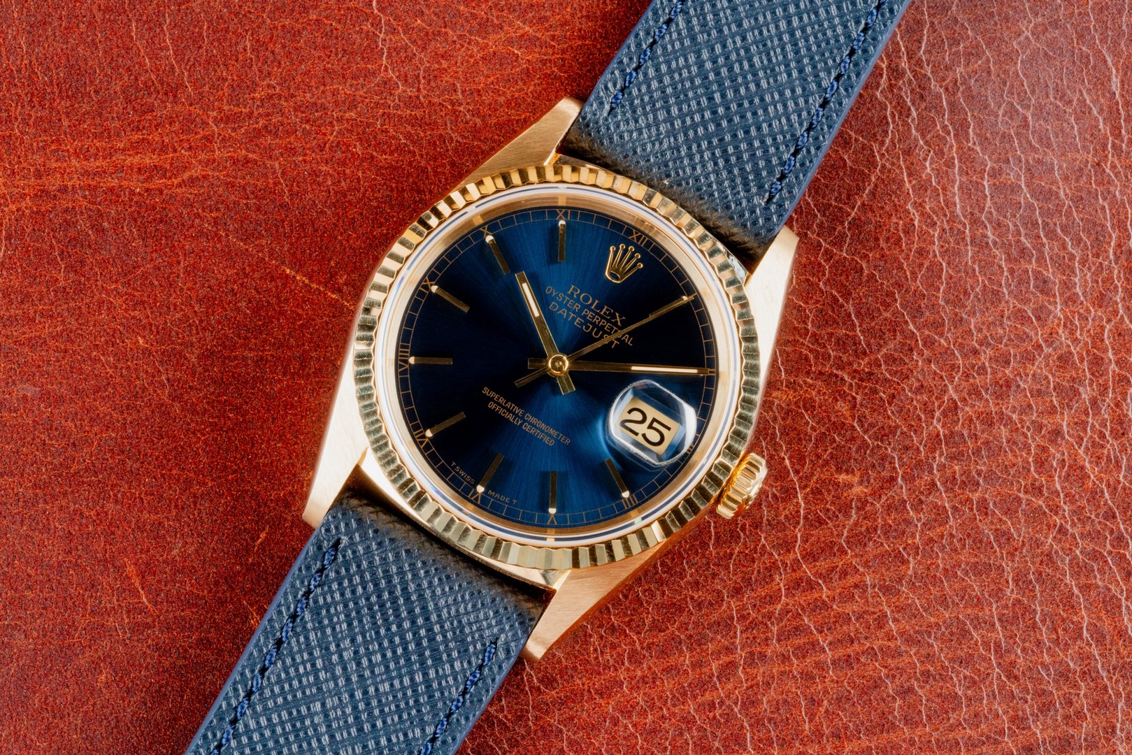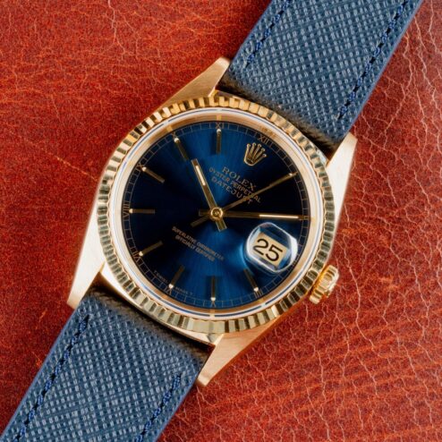 Die kommt am brandneuen blauen Molequin Lederarmband und mit Rolex Dornschließe (vergoldet). Aufgrund des nicht vorhandenen Bandabriebes am Gehäuse sind wir übrigens sehr sicher, dass die Uhr immer am Lederband getragen und auch ausgeliefert wurde.