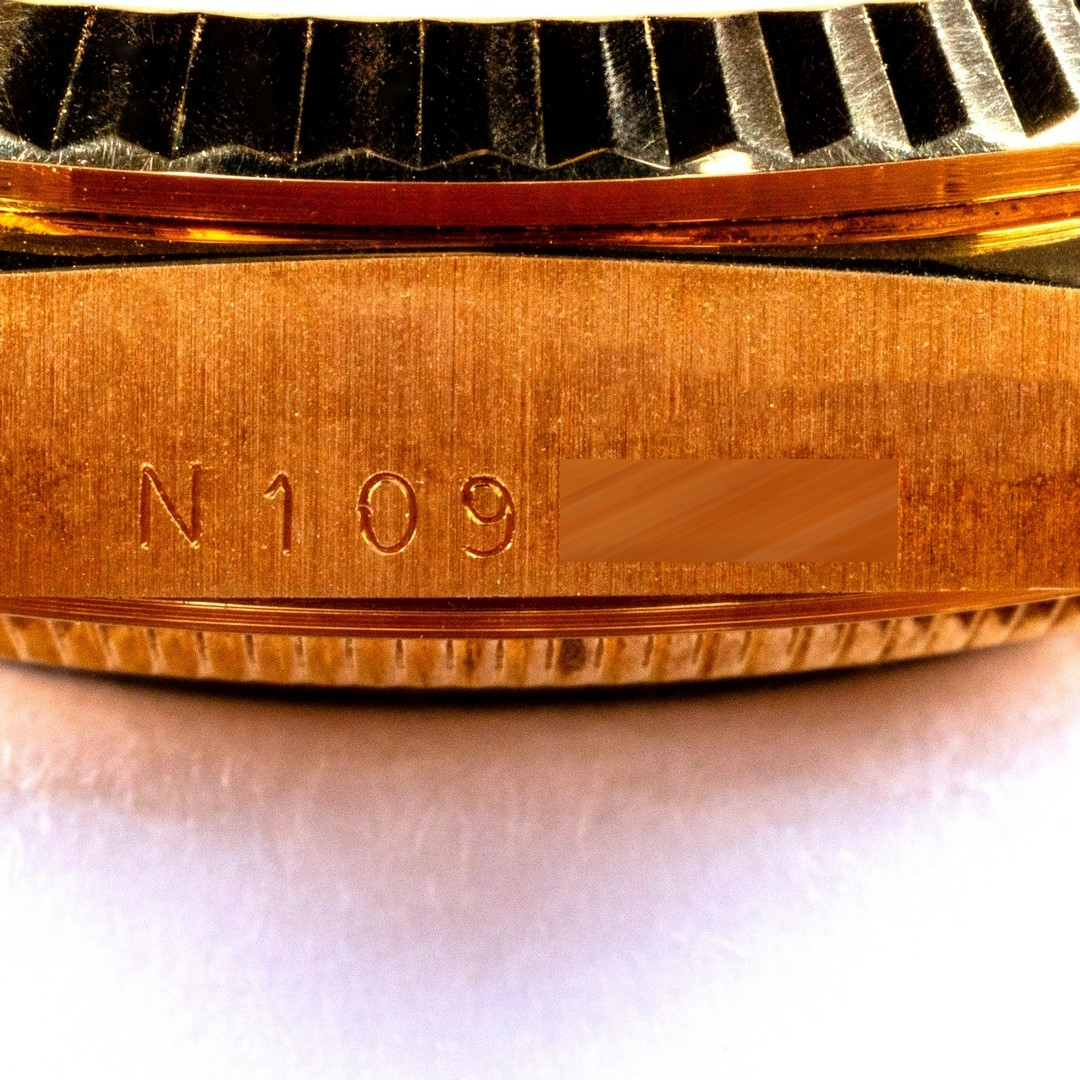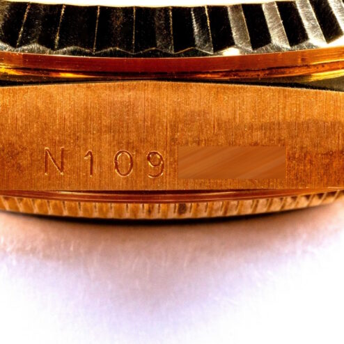 Das Gehäuse ist im top Zustand. Absolut unpoliert, zeigt es perfekte Hörner, super scharfe Kanten und ein wundervolles mattes Finish auf der Gehäuseoberseite. Tragespuren sind in minimaler Form vorhanden, aber das Gehäuse ist wirklich herausragend schön. Die perfekte Qualität wird auch durch den intakten Rückdeckelaufkleber bestätigt.