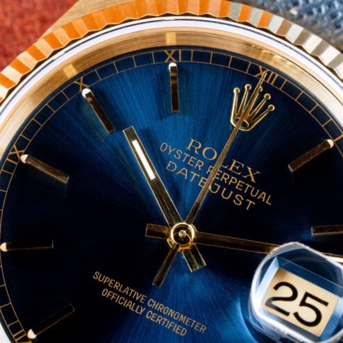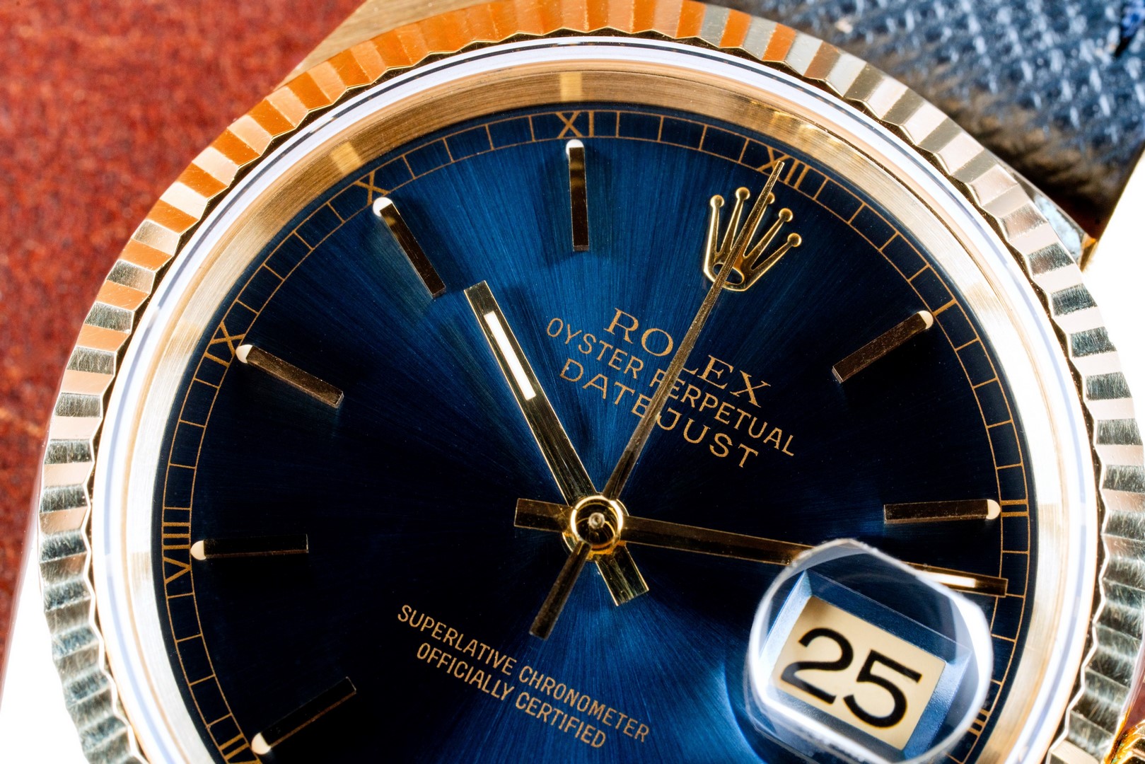 Beschreibung: Wundervolle unpolierte Gelbgold Datejust mit herrlichem blauen Sonnenschliff Zifferblatt.