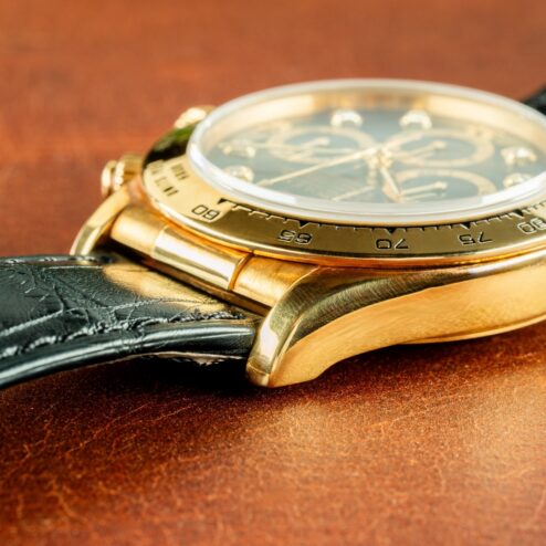 Das schwarze Kroko-Lederband ist neu und ungetragen. Es ist die L Version und damit auch für große Handgelenke geeignet. Die 18 Karat Rolex Faltschließe ist wie die Uhr unpoliert, mit oberflächlichen Tragespuren.