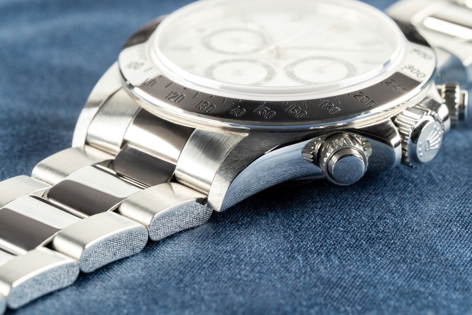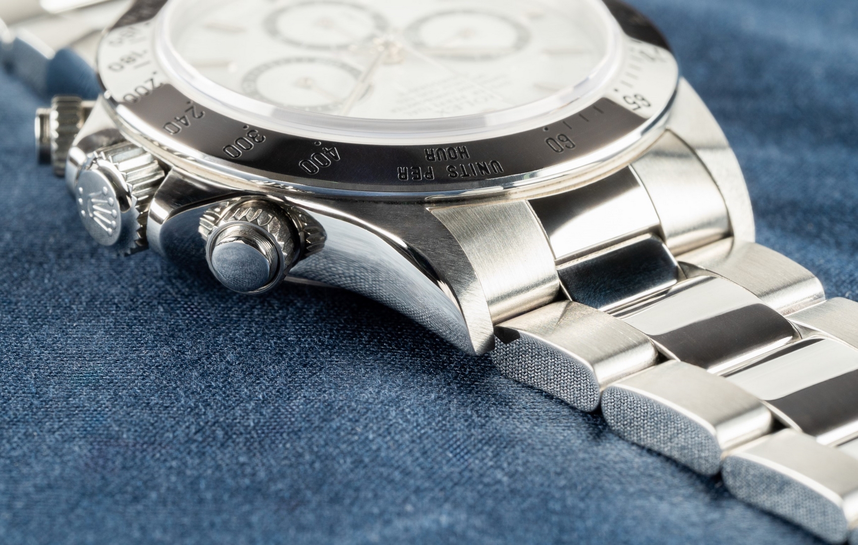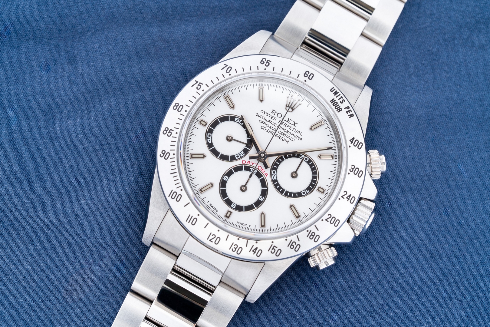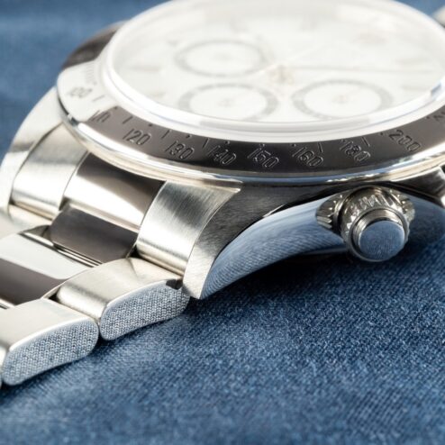 Das weiße Daytona Zifferblatt ist noch mit Tritium Leuchtmasse belegt und natürlich im perfekten Zustand. Die Leuchtmasse hat eine leicht cremige Patina angenommen. Die Zeiger sind ebenso perfekt, mit stimmiger Patina zum Zifferblatt.