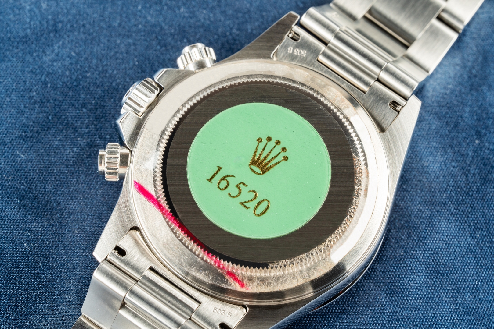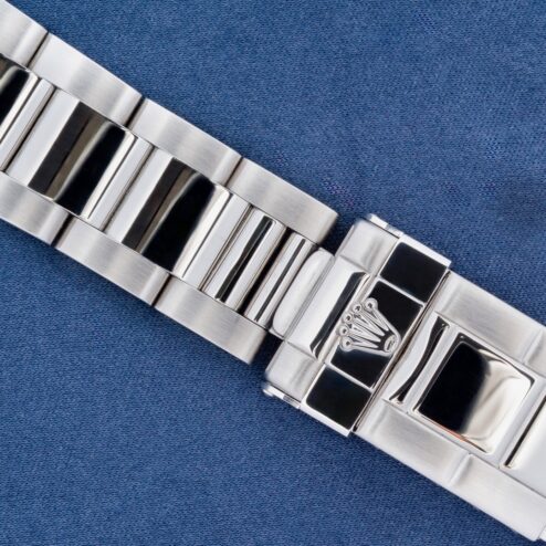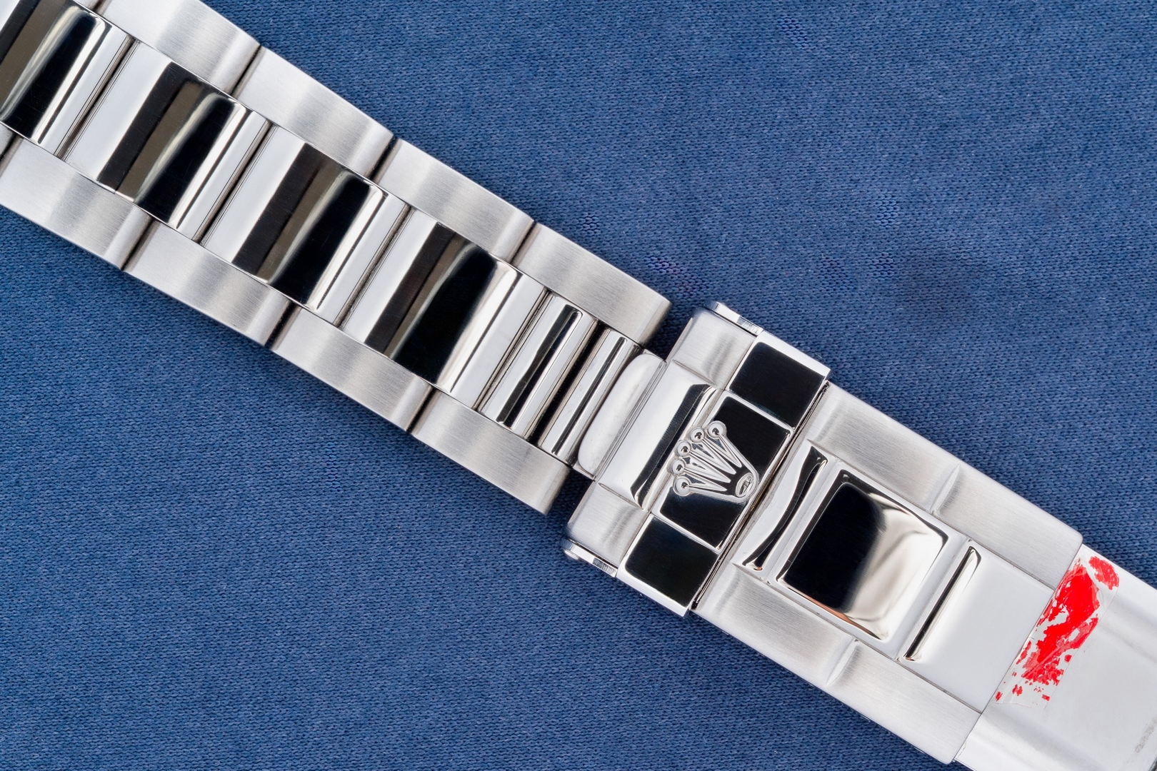 Das 78390 Oysterband mit korrekten 503B Anstößen ist wie die Uhr ungetragen. Es kommt mit allen Gliedern und der Aufkleber auf der Schließe ist noch vollständig vorhanden, einzig die rote Farbe hat sich im Laufe der Jahrzehnte etwas gelöst. Natürlich handelt es sich auch um das originale Armband zur Uhr, mit Schließencode Z8 für August 1997.