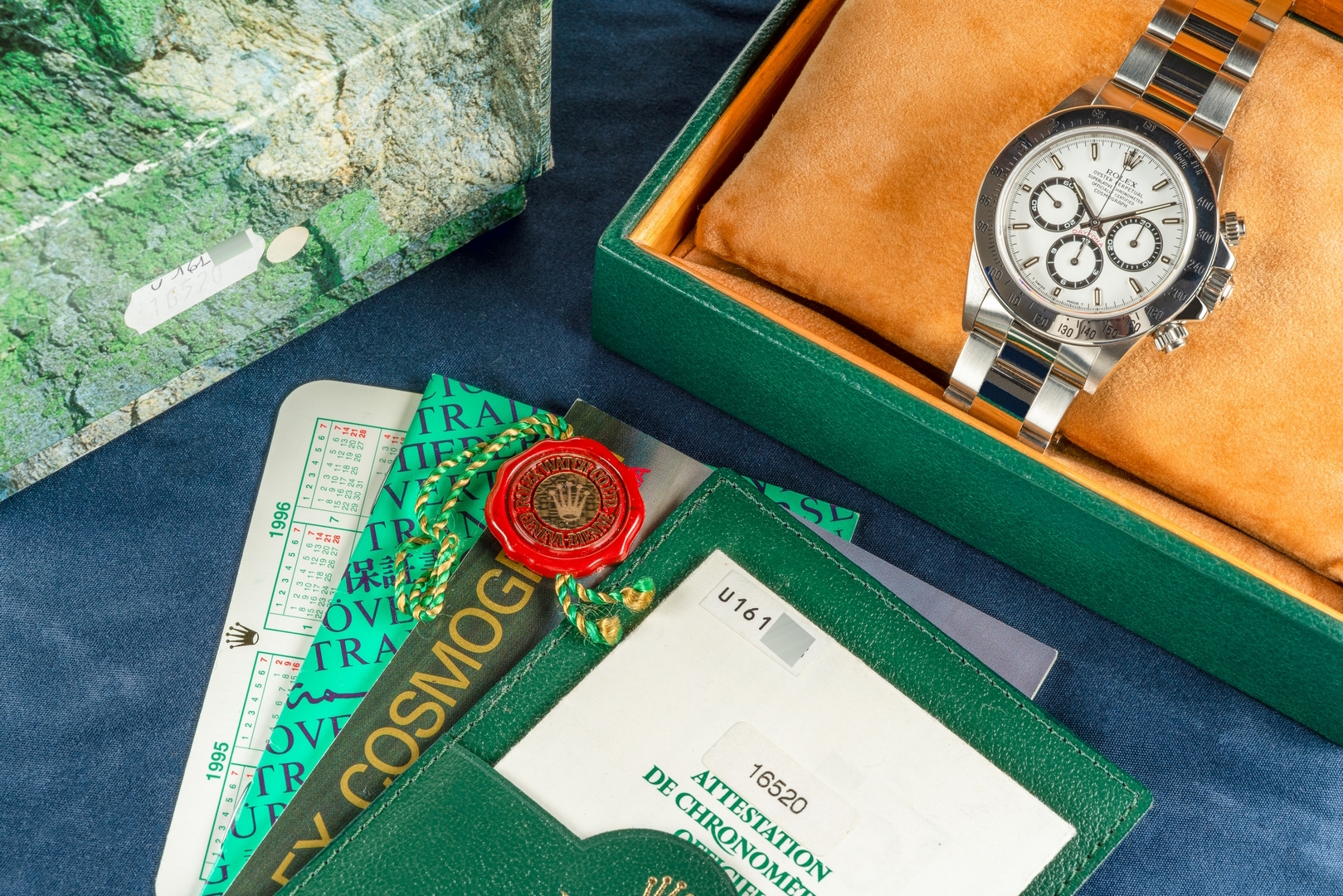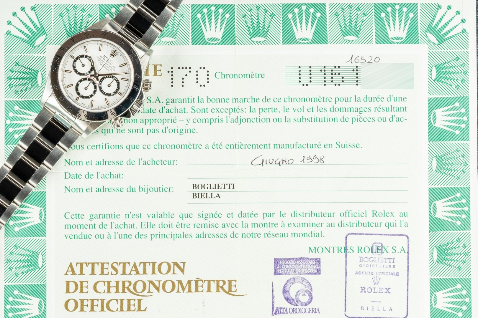 Diese tolle Tritium Zenith Daytona erfreut ihren neuen Besitzer mit Box und Papieren. Sie wurde im Juni 1998 von BOGLIETTI GIOIELLIERE in Biella (LC 170 Italien) verkauft. Der Lieferumfang ist top, inkl. zeitlich korrektem Booklet in italienischer Sprache, Übersetzung und rotem Siegel.