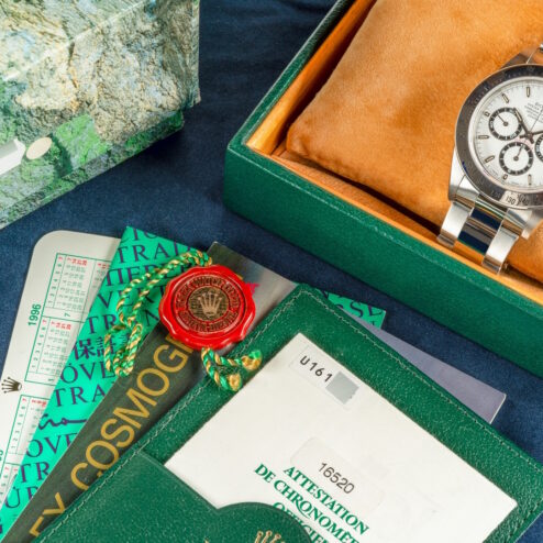 Fazit: Eine ungetragene perfekte Zenith Daytona in Tritium Ausführung. Warum ich dies betone? Weil die meisten ungetragenen Zenith Daytonas in der letzten Variante (späte U bis P Serie) zu finden sind. Frühere Varianten mit Tritium Leuchtmasse sind mittlerweile sehr selten geworden.