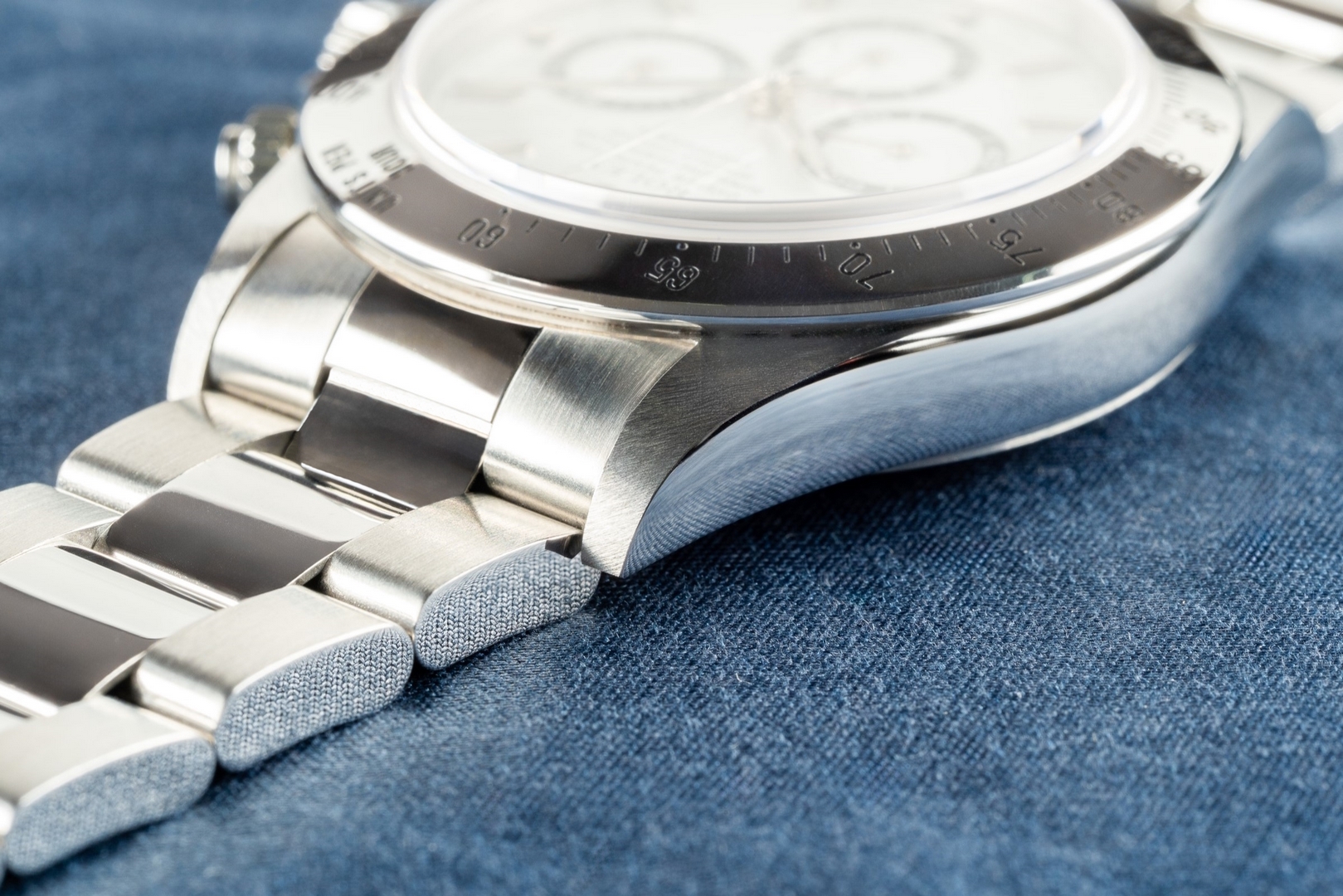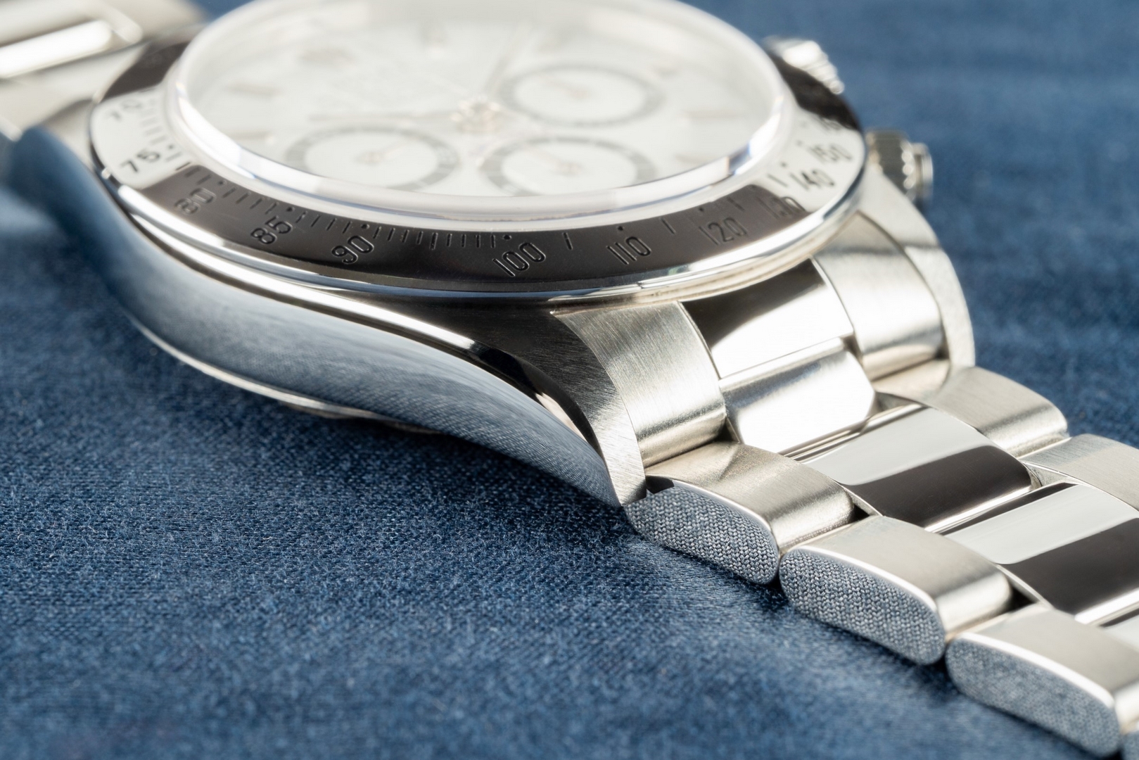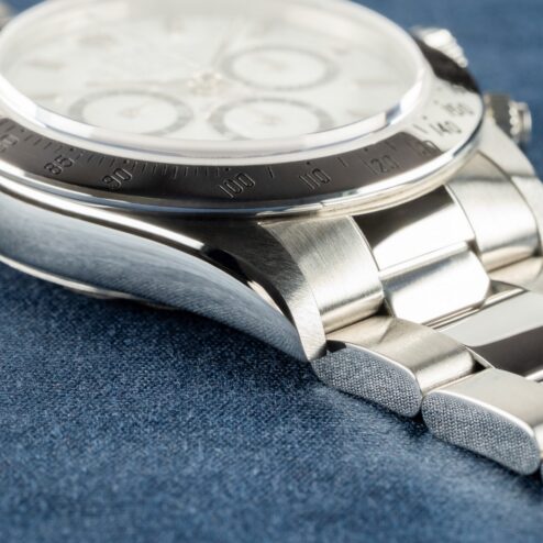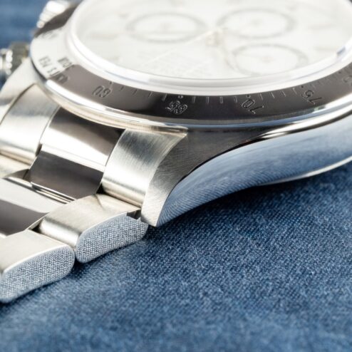 Das Gehäuse ist im perfekten und ungetragenen Zustand. Wie die Bilder zeigen, ist diese tolle Zenith Daytona ungetragen und präsentiert sich daher mit perfektem Gehäuse, messerscharfen Kanten und einem ebenso perfekten matten Finish auf der Gehäuseoberseite.