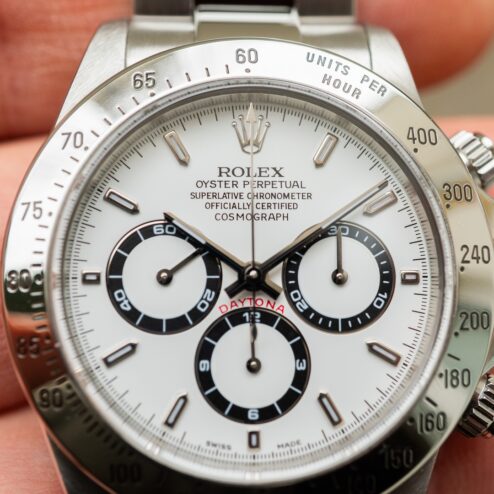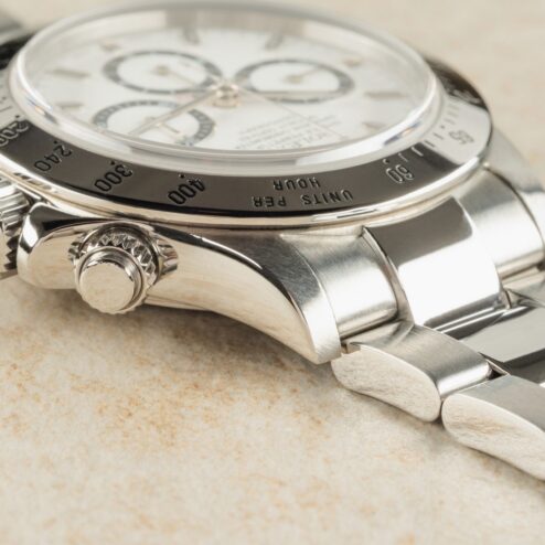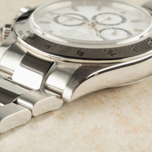 Das weiße Daytona Zifferblatt ist perfekt und natürlich die korrekte letzte Version mit Superluminova Leuchtmasse. Die Zeiger sind ebenso perfekt und auch mit Superluminova wie es sein soll.