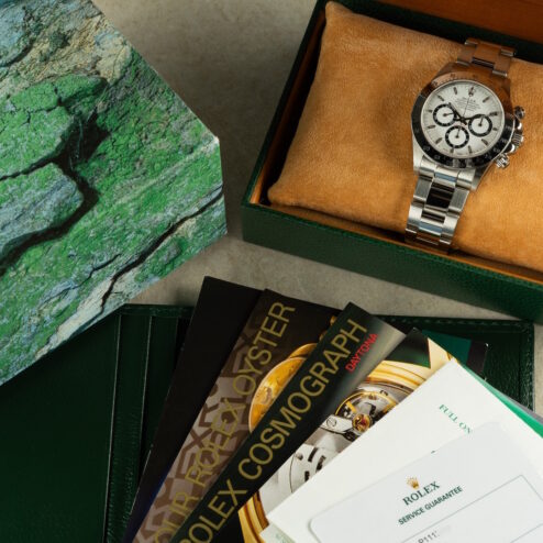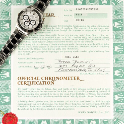 Diese rare Daytona kommt im full set. Sie wurde im Dezember 2000 von BELL JLRS in Tennessee (USA) verkauft. Der Lieferumfang ist wirklich perfekt, inkl. beiden Booklets (Daytona und Oyster) Ledermäppchen und der Rolex Servicekarte aus dem Jahre 2015