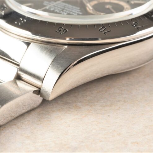 Diese feine Daytona erfreut ihren neuen Besitzer mit deutschen Box und Papieren. Sie wurde im November 2000 von Juwelier Lepple in Esslingen verkauft. Der Lieferumfang ist perfekt, denn nicht nur Box und Papiere, sondern auch beide Booklets, die Übersetzung und das Siegel sind erhalten geblieben.