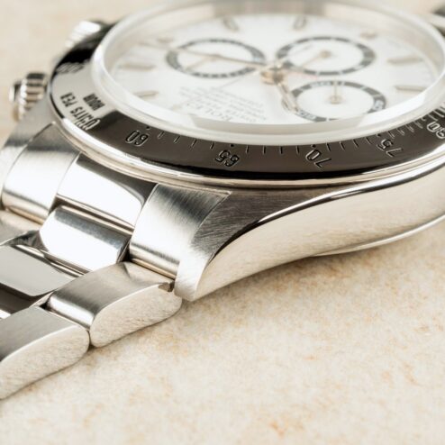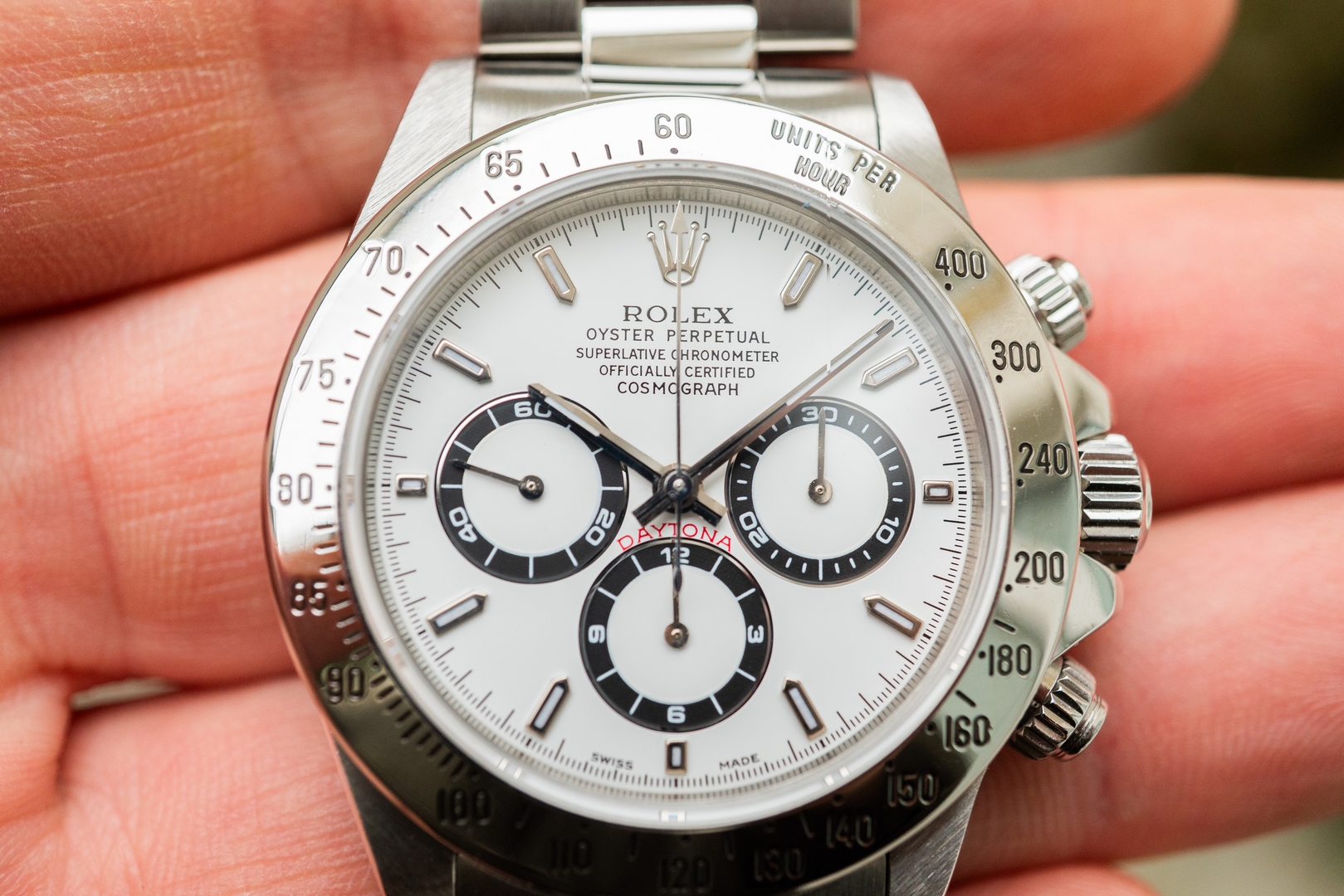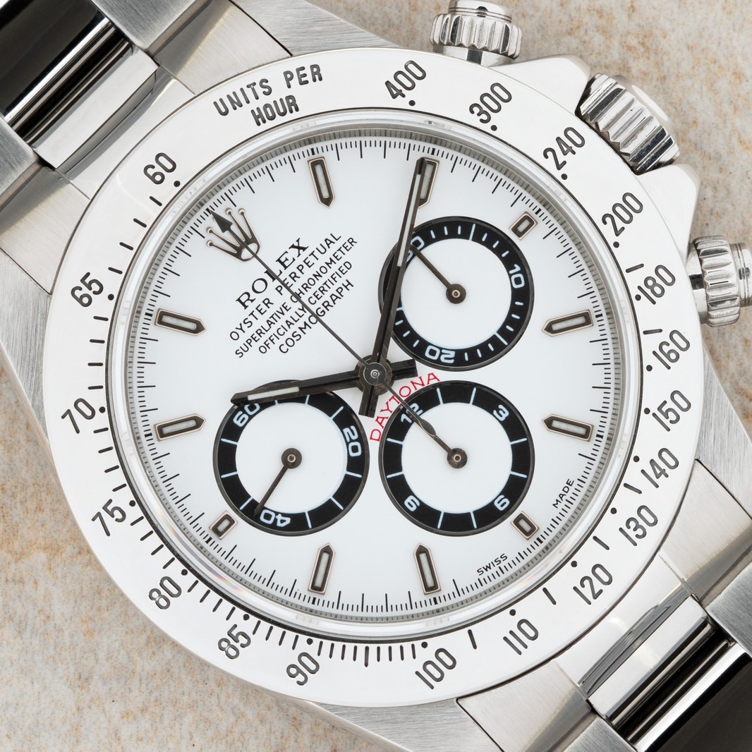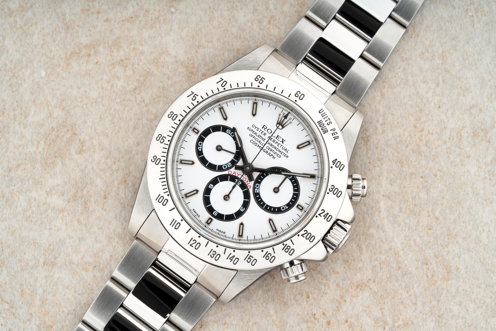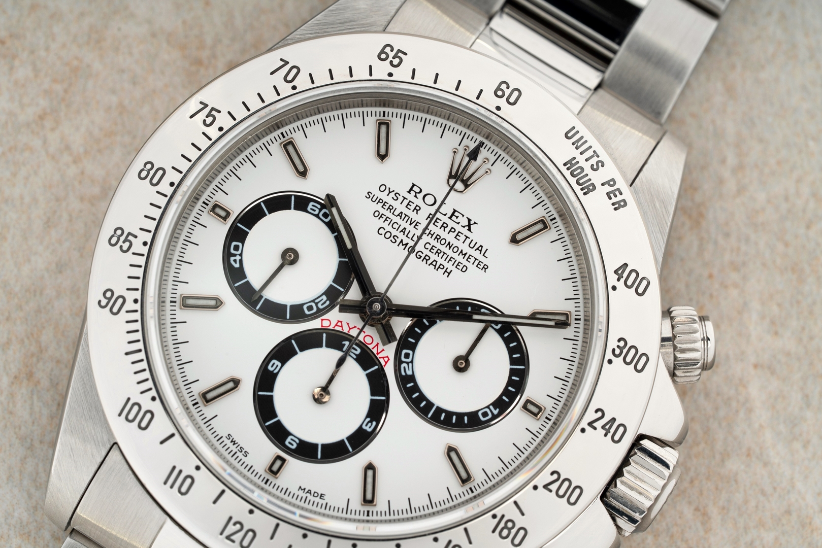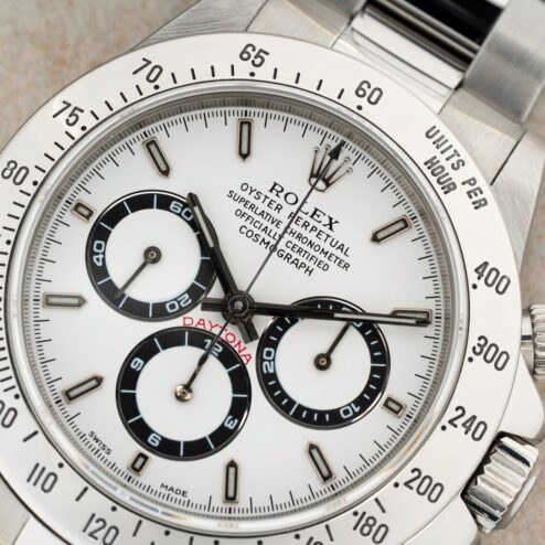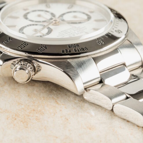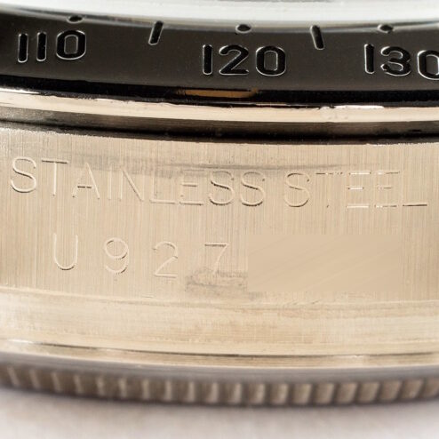 Das weiße Daytona Zifferblatt ist im perfekten Zustand ohne Schwächen. Es handelt sich hier bereits um die seltene und gesuchte Swiss Made Variante mit Superluminova Leuchtmasse. Diese Blattvariante wurde ab der späten U Serie verbaut und passt somit perfekt zur Seriennummer.