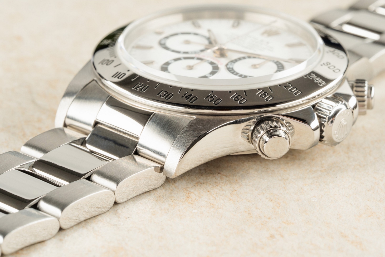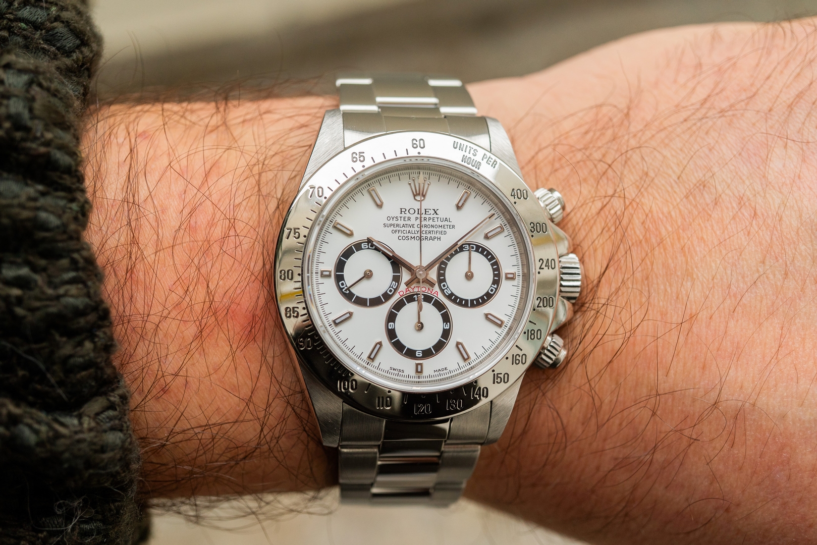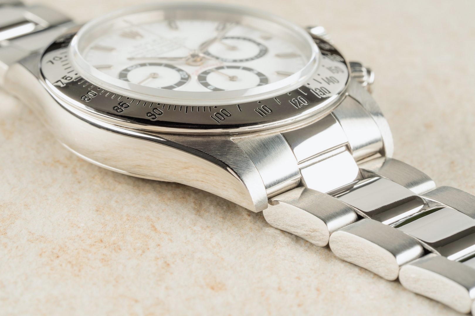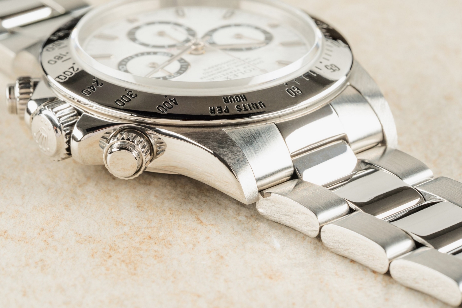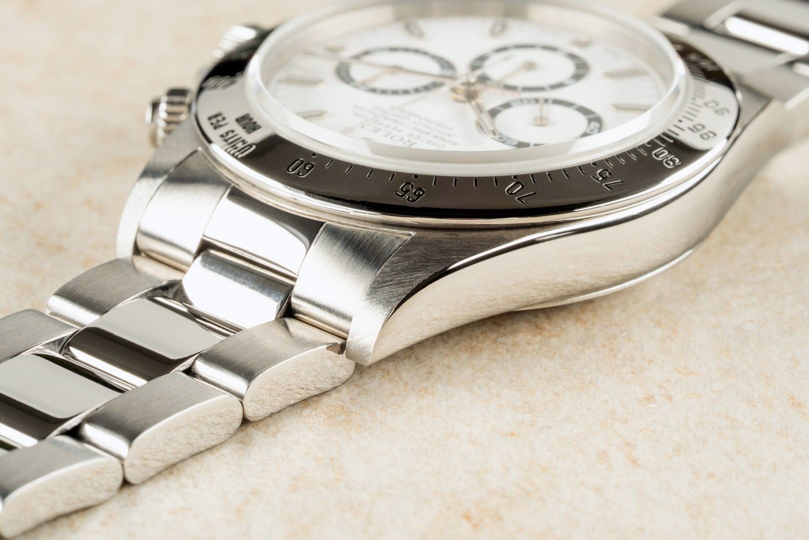 Das weiße Daytona Zifferblatt ist im perfekten Zustand ohne Schwächen. Es handelt sich hier bereits um die seltene und gesuchte Swiss Made Variante mit Superluminova Leuchtmasse. Diese Blattvariante wurde ab der späten U Serie verbaut und passt somit perfekt zur Seriennummer.