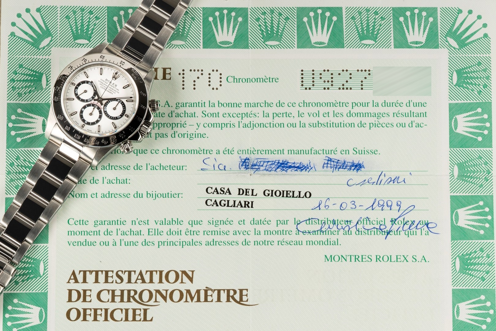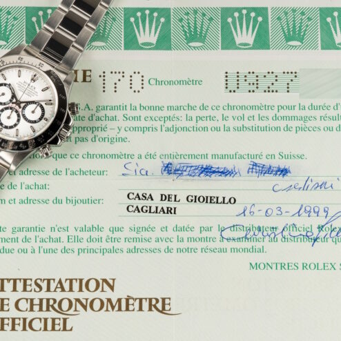 Diese feine U Serien Zenith Daytona stammt aus Italien. Sie wurde am 16.03.1999 von Case Del Gioiello in Cagliari verkauft.