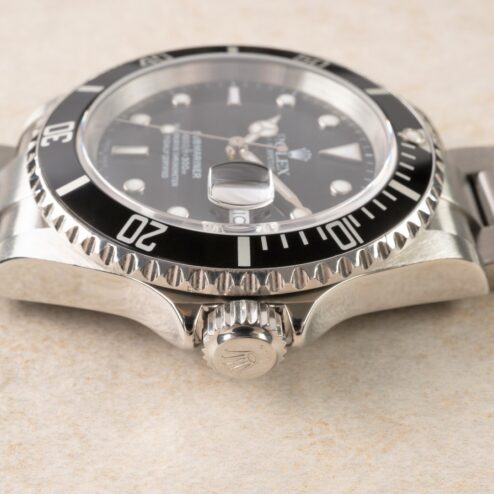 Das schwarze Submariner Date Zifferblatt mit Superluminova Leuchtmasse ist im perfekten Zustand ohne Schwächen. Der Zeigersatz ist ebenso perfekt.