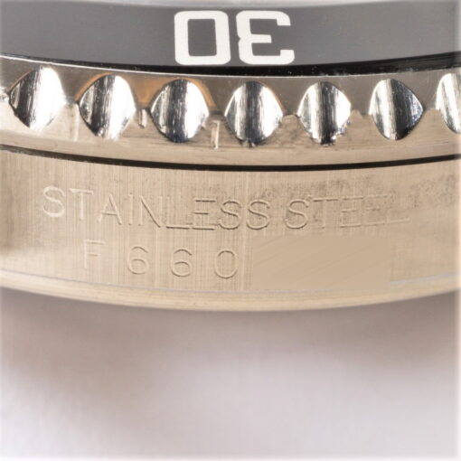 Das Inlay ist tiefschwarz, mit ebenso leichten Tragespuren. Das Saphirglas ist perfekt.