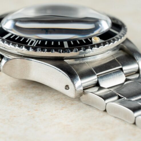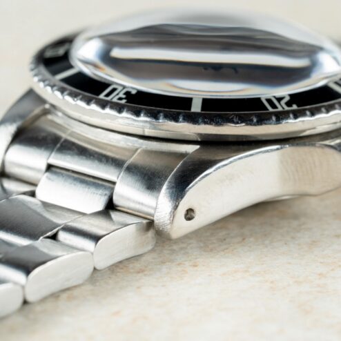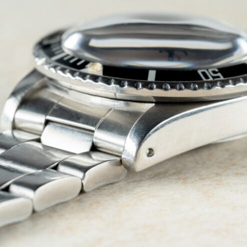Das Gehäuse ist im sehr guten Vintage Zustand. Die Geschichte der Uhr ist uns perfekt bekannt und daher können wir sagen, die Uhr wurde im Jahre 1980 erstmalig und einmalig leicht poliert. Dies im Zuge eines Rolex Services und die Politur erfolgte super schonend, mit geringem Materialabtrag. Daher präsentiert sich diese Double Red mit starkem Gehäuse, volle Hörner, scharfen Kanten und einem guten matten Finish auf der Gehäuseoberseite. Tragespuren sind vorhanden, aber so muss eine Vintage-Toolwatch aussehen.