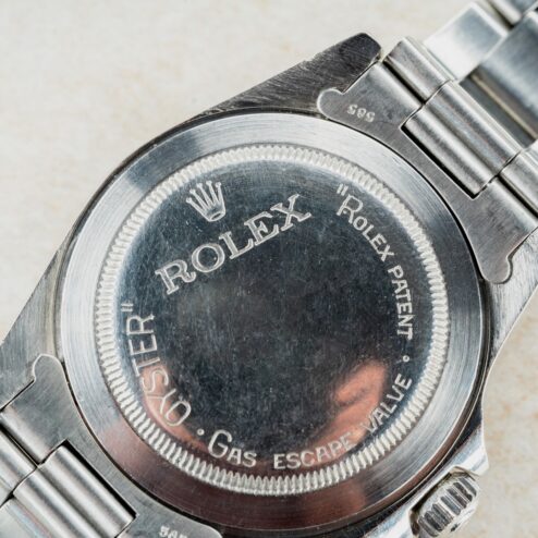 Der Rückdeckel ist der originale Rückdeckel mit geradem Rolex Schriftzug und voller Seriennummer im Deckel innen graviert.