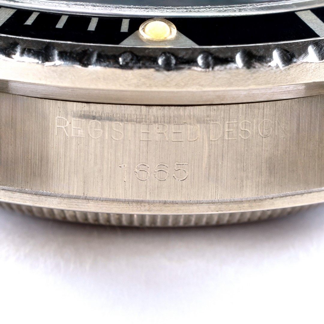 Die Lünette ist eine originale 1665 Lünette mit der super breiten Kante. Diese Lünetten waren an allen 1665 Double Red zu finden, wurden aber oft im Laufe der Zeit gegen die moderne Variante getauscht. Nochmal zur Sicherheit: Die Lünette ist nicht poliert, die gehört so!