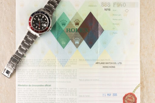 Diese tolle F Serien GMT kommt mit Box und Papieren. Sie wurde am 25.05.2005 von Artland Watch Co. in HongKong (LC 888) verkauft.