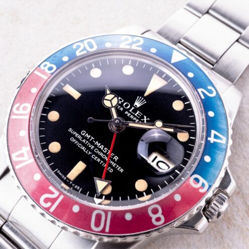 Beschreibung: Tolle 1675 GMT-Master mit MK1 longE Blatt und cool gefadetem redback Inlay.